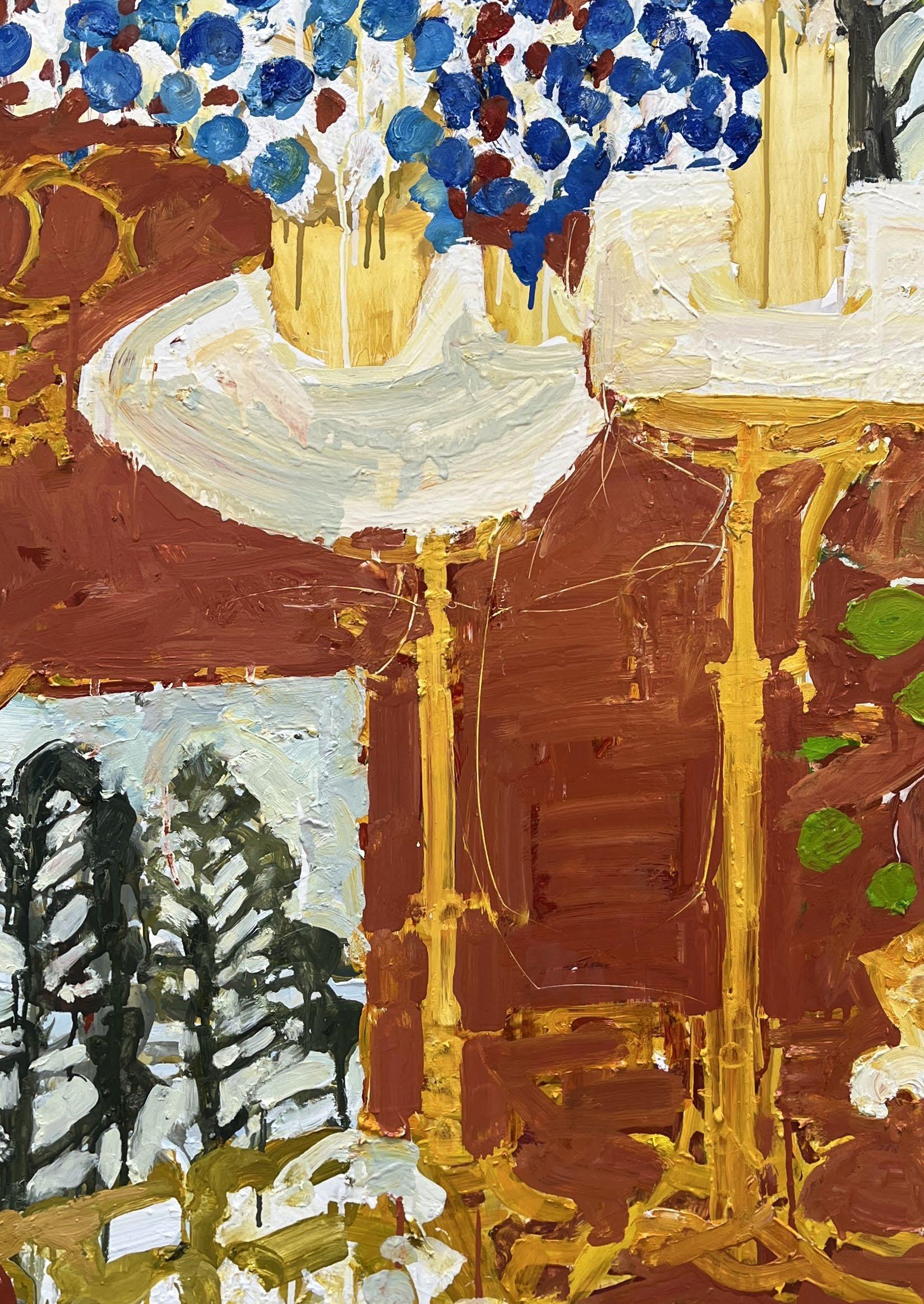 For Ffiona Lewis, Patrick Heron has been a major influence for most of her painting life, so her understanding of Matisse is deeply inflected by Heron’s thought. We know that he described The Red Studio as hugely influential, and Mel Gooding observed in his authoritative monograph on Heron that Matisse’s painting always remained a creative presence in his life and work. For Lewis, the best way of coping with such powerful influences is simply to carry on painting and work through them in this way. Her approach is to learn the lessons from the past that are most relevant to her, absorb what they have to offer and translate that into her own artistic language. Her braided trees and vigorously outlined tables, set against luscious reds and browns, attest to this.