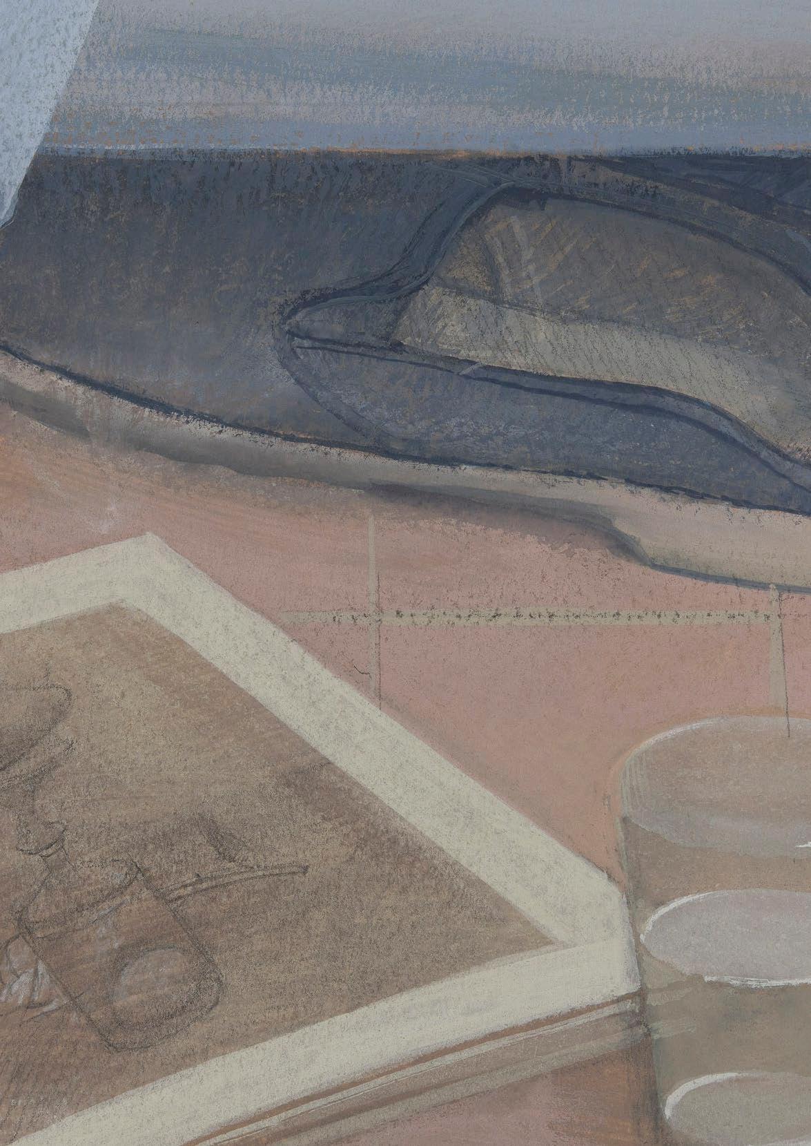 long stick, and painted in the kind of red you find in nightmares. Although the source is a well-known photograph of the artist in old age, Emsley has kindled a hellish conflagration in his picture, as if all the previous history of art is about to be incinerated by the arch revolutionary Matisse, who finds his justification and precedent in Cézanne. Emsley’s painting hints at the curse of being an artist which is not all rhapsodising over light and space, but can also be a dungeon of anxiety and doubt. David Inshaw’s Court is probably the most abstract image of his long career as a landscape and figure painter. Depicting the interior of a Fives court, the box-like space is divided by lines and wall markings, and a blue-topped black buttress at lower left. The predominant colour is the red of the floor, a rich mixture of Venetian red and Naples yellow.