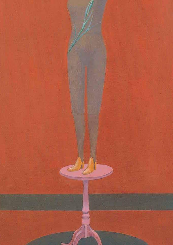 In my painting of the Red Room, I also use the red as a common denominator, from which the other colours - particularly the green foliage - emerge. The white figure’s arms act as a bridge between the left and right side of the painting, and the chair sits back in the space behind, aiming to create a three dimensional space.