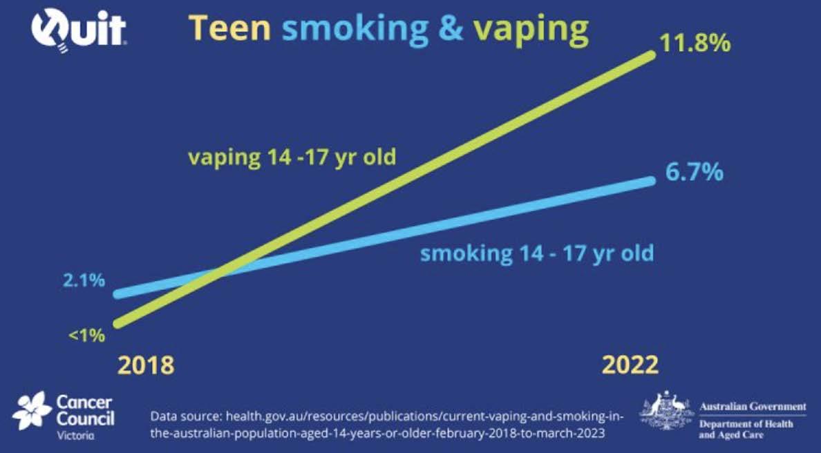 More recently a new threat to public health has emerged – VAPING. Data analysed by Cancer Council Victoria’s Centre for Behavioural Research in Cancer shows sharp increases in the use of e-cigarettes (a.k.a vapes) by young people, including teenagers. Not only are we seeing increases in vaping among young people, there are recent signs that smoking among young people may also be on the rise! Research by the Australian National University has found that young people who vape are about three times as likely to take up smoking.