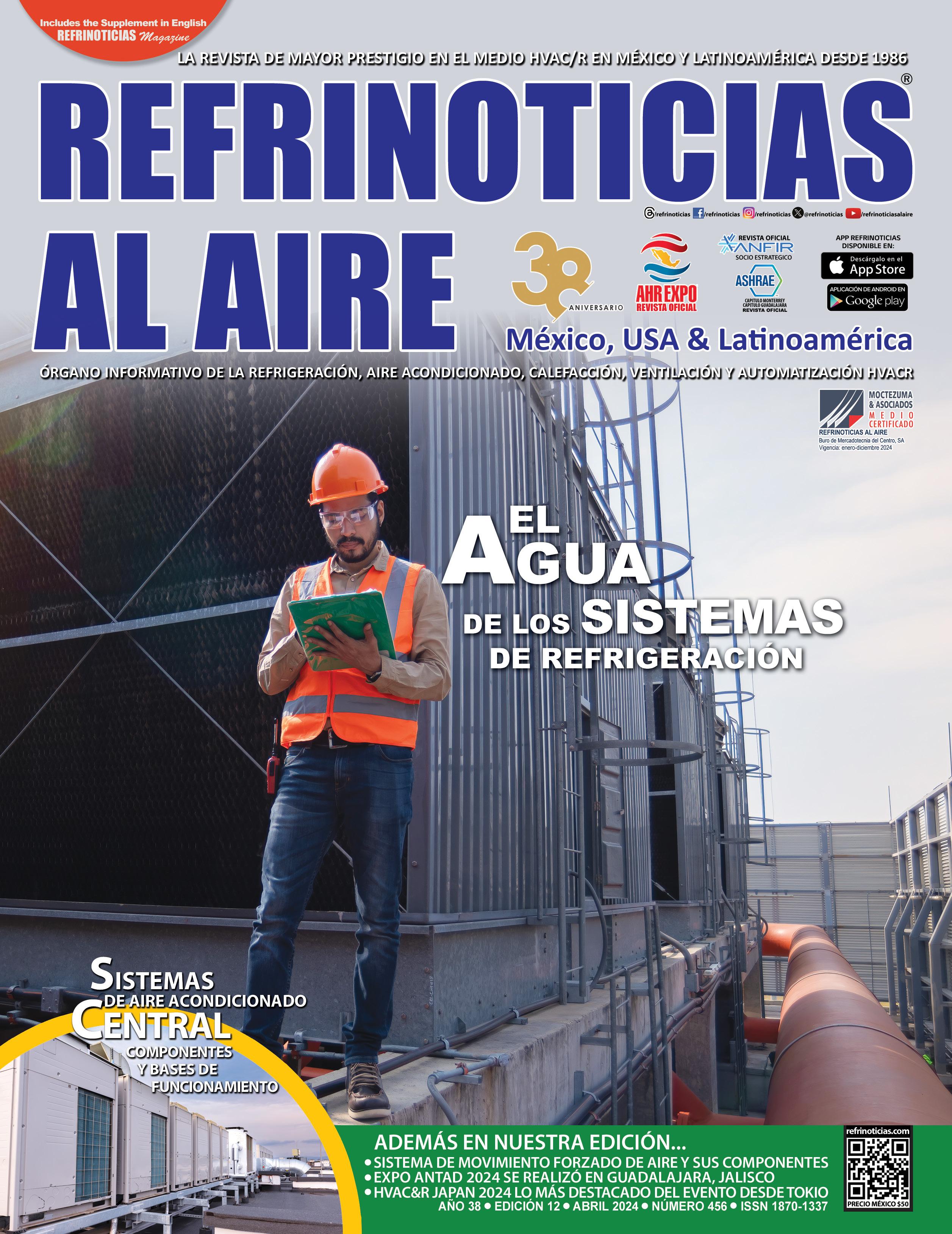 REFRINOTICIAS AL AIRE REVISTA IMPRESA SÓLO EN PAPEL CON CERTIFICADO DE ORIGEN SUSTENTABLE EDICIÓN DIGITAL APP REFRINOTICIAS NUESTRAS REDES SOCIALES: PODCAST DE REFRINOTICIAS CAPÍTULO GUADALAJARA CAPÍTULO MONTERREY REVISTA OFICIAL MEXICANA REVISTA OFICIAL SOCIO ESTRATEGICO REVISTA OFICIAL REVISTA OFICIAL DE: MEDIO CON CIRCULACIÓN CERTIFICADA Vigencia: enero - diciembre 2024 @refrinoticias /refrinoticias /refrinoticias /refrinoticias /refrinoticiasalaire AÑO 38 I ED. 12 I ABRIL 2024 I NUM. 456 ESTA EDICIÓN INCLUYE EL SUPLEMENTO EN INGLÉS REFRINOTICIAS Magazine EDITION APRIL 2024 2 Editorial 6 Noticias México 8 Noticias USA y Canadá 10 Noticias Sudamérica 12 Noticias España & Europa 14 Noticias China & Asia 17 Estudio del Técnico 18 Casos de Éxito NUESTRA PORTADA: EL AGUA DE LOS SISTEMAS DE REFRIGERACIÓN IMAGEN: DREAMSTIME DISEÑO DE PORTADA: REFRINOTICIAS AL AIRE 19 Nuestro Entorno 20 Sabías Que 21 Tips y Buenas Ideas 29 Reporte Especial 34 Empresas y Empresarios 36 Nuevos Productos y Técnologías 38 Reporte ASHRAE Monterrey 40 Máquina del Tiempo y Últimas Noticias