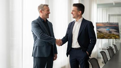 Luxstar’s Kin Chen (left) and Mark McIvor, of Flamerite Fires, having just signed the agreement.