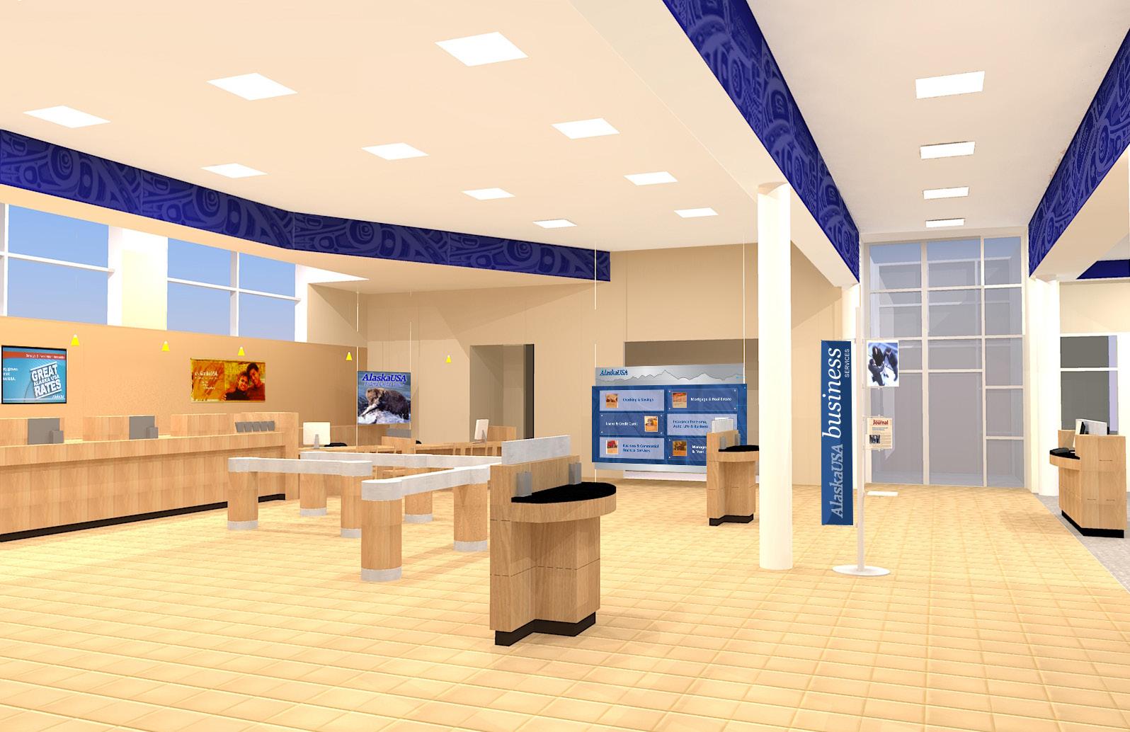 Reilly Design designed the new look for Alaska USA FCU Retail and Traditional branches located throughout Alaska and Washington State. Scope includes design of signature elements, new branch layouts and signature material palettes.