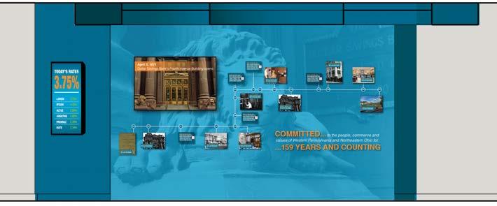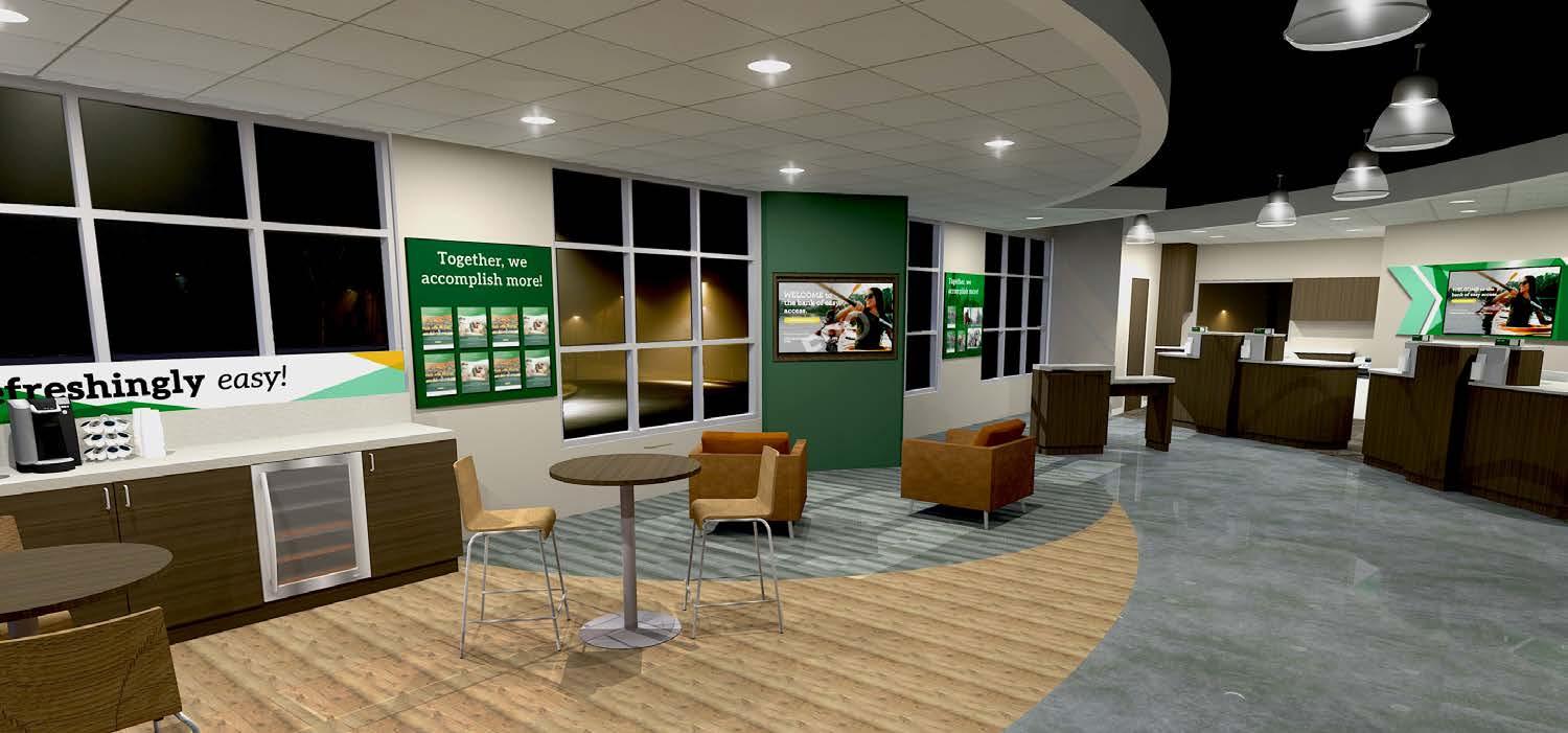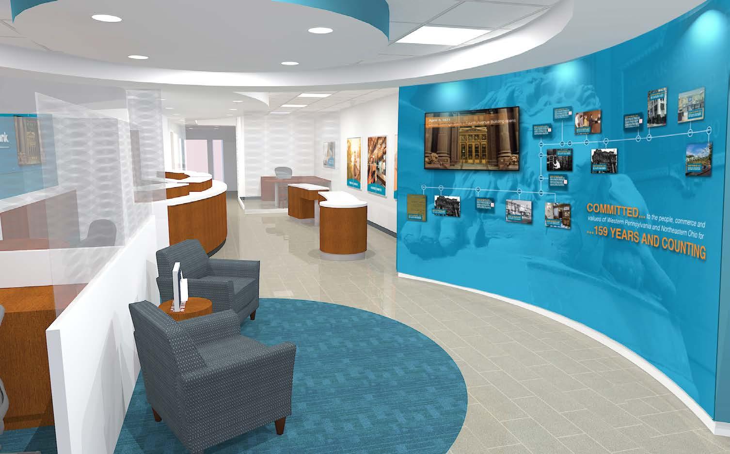 Reilly Design collaborated again with Adrenaline on design concepts to redesign a branch that had begun construction. The goal was to re-work not only the floor plan, but to reimagine the entire customer experience. Special efforts were made to showcase the bank’s 159 year history and represent their lines of business and various product offerings. The look and feel was to be a new updated fresh, less ‘traditional’ look.
