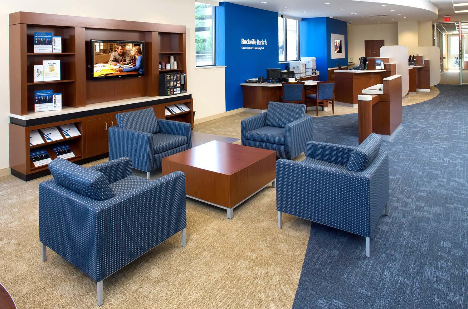 Reilly Design designed this new branch to replace a former former post office. The goal was to create a new branded environment for Rockville to introduce themselves to a brand new market. The goal was to create and environment to cater to small business, wealth management customers as well as feature Rockville’s technology offerings