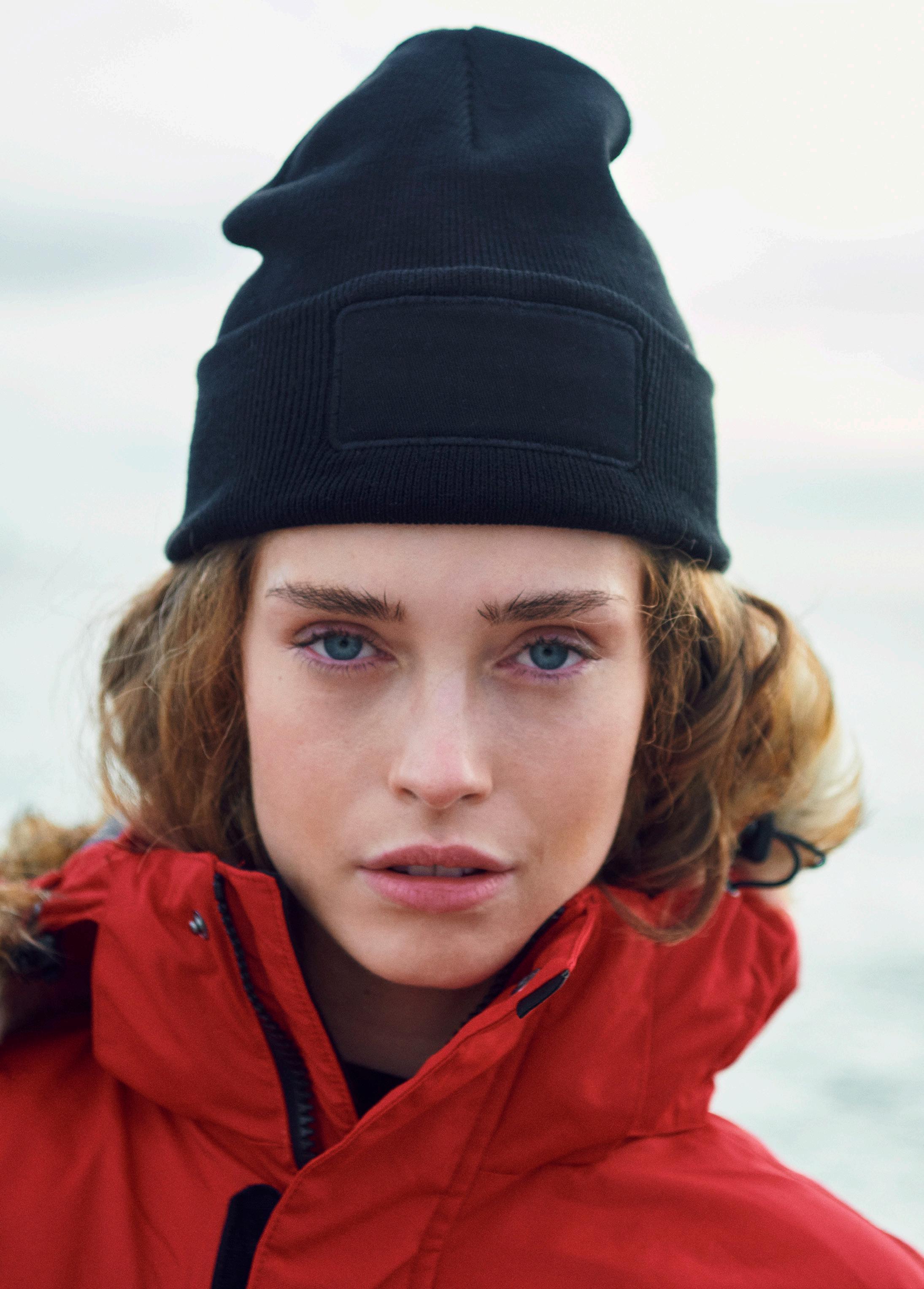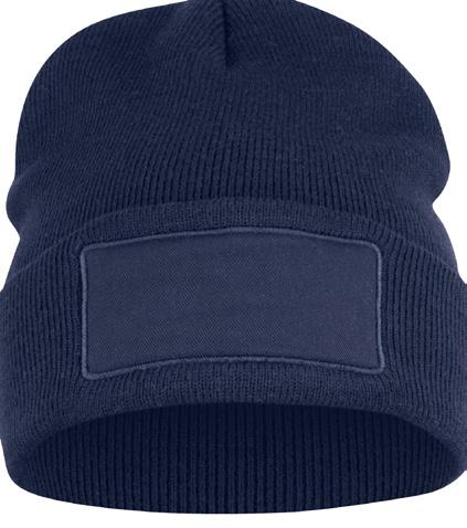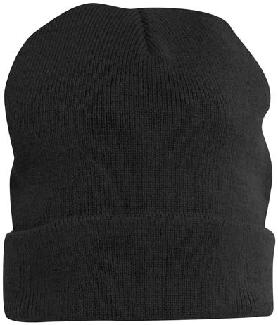 Stickad mössa med uppvik. Fastsydd platta för den perfekta märkningen (mått 9,5x4,5 cm).