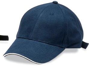 Keps i borstad bomullstwill med delvis kontrastfärgad skärm, “sandwich piping” och justerbart mässingspänne.