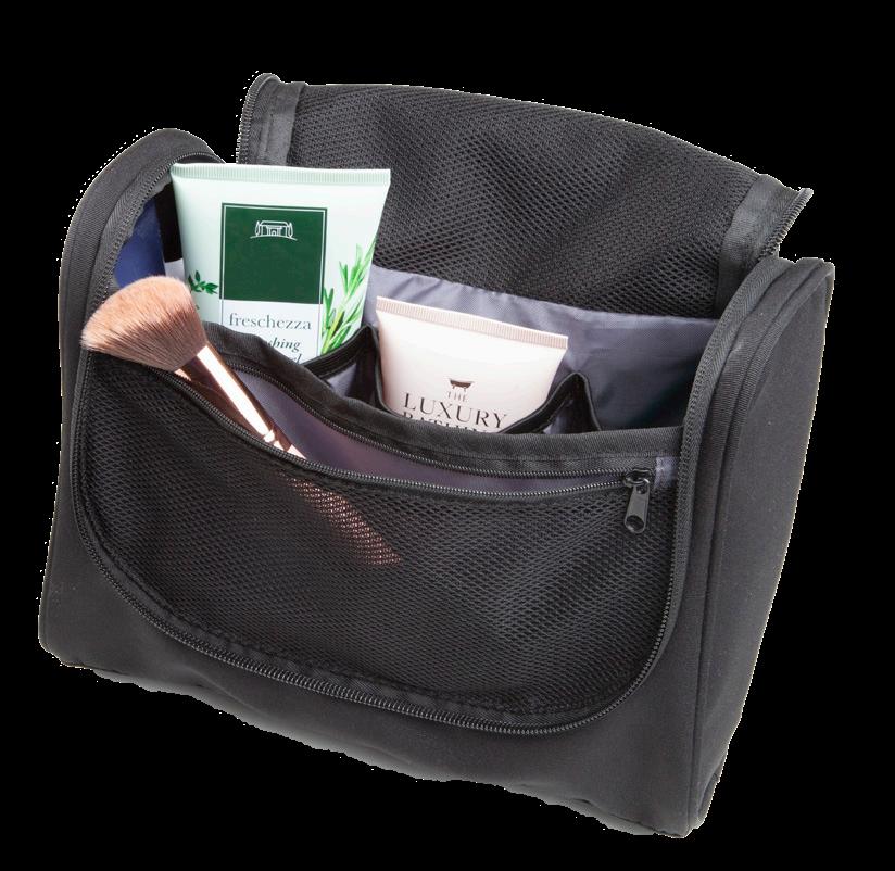 En modern necessär fullspäckad med små fickor och fack i såväl vanligt material som med nät för att passa olika toalettartiklar. Stor ficka med dragkedja på baksidan för enkel åtkomst. Levereras med såväl handtag som krok för att enkelt kunna hängas upp när den öppnas i badrummet. Mått och volym: 25x19x10 cm - 5 L.