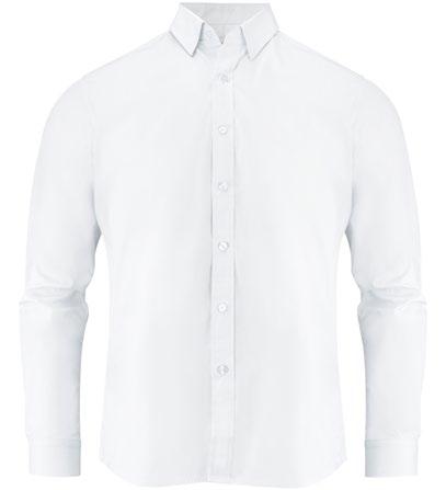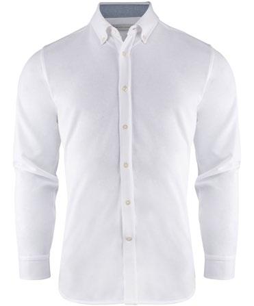 Jerseyskjorta med oxford-look. Vävda detaljer inuti krage och sidoslitsar. ”Button down” krage på herr. Bystinsnitt och figursydd i ryggen på dam. Pärlemorfärgade knappar. Reglerbara manschetter.