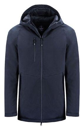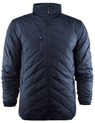Vadderad jacka. Vind- och vattentätt material med andasfunktion. Släta, vattentäta blixtlås fram och i sidfickor. Reglerbart ärmavslut med tryckknappar. Innerfickor. Justerbar huva med elastiska snören.