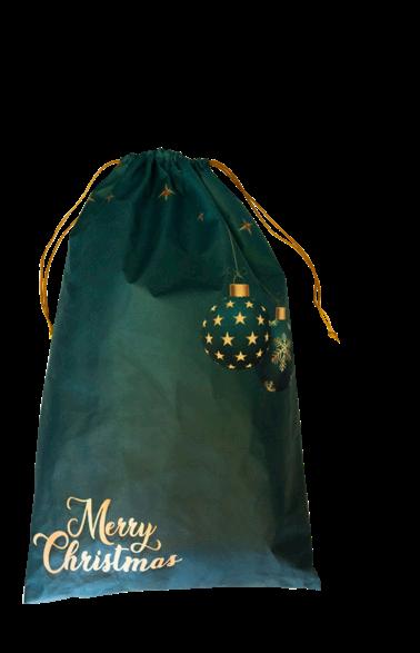 Julegaveposen som alle profesjonelle nisser ønsker seg. Laget av et slitesterkt materiale som tåler tøffe tak på sleden bak reinsdyrene. Julegaveposen finnes i fire størrelser: S for toalettmappe, M for dataveske eller dataryggsekk, L for weekendbag og XL for kabinkoffert. Alle størrelser har bilde av julekuler og teksten Merry Christmas i gull. Julegaveposen kan brukes flere ganger.