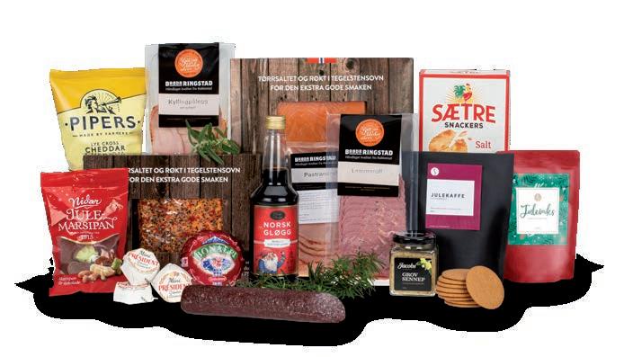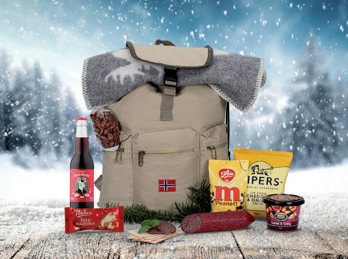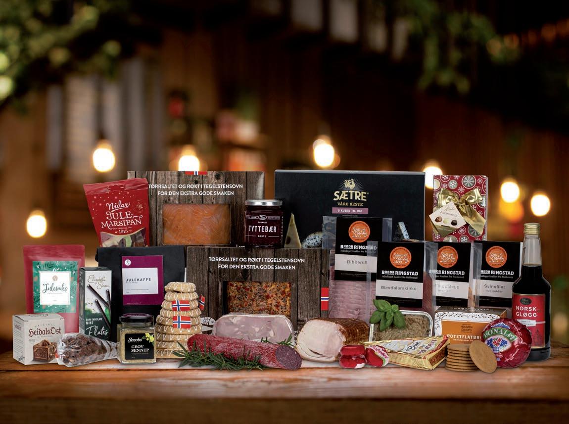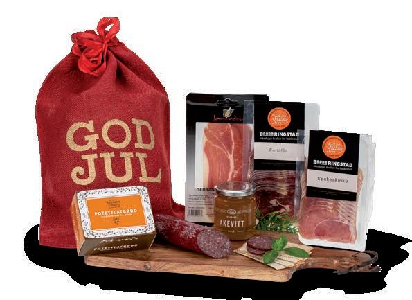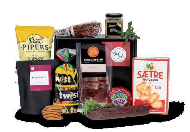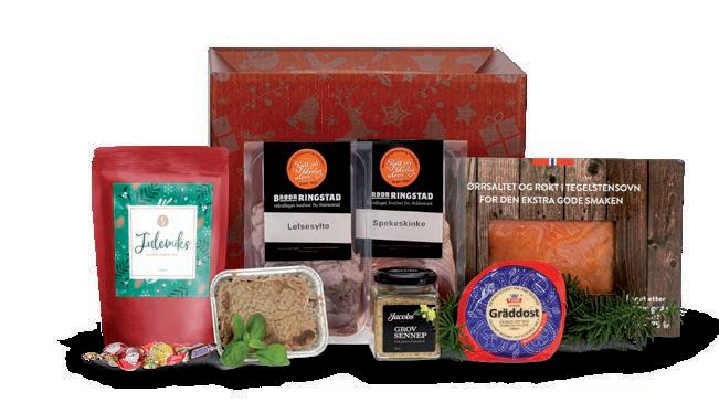 Innhold: Lefsesylte skåret 100g, Julepostei ovnsbakt 200g, Tine greddost 380g, Jacobs sennep grov 180g, Røkt laks skivet gavesjaktel 150g, Julemiks 150g merkesjokolade biter, Norsk spekeskinke skivet 100g, Julekaffe filtermalt 200g, Rødvinspølse snabb 260g.