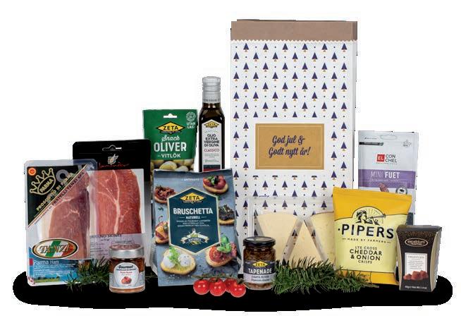 Innhold Baby Bell mini ost 120g, Julekaffe filtermalt 200g, Rødvinspølse snabb 260g, Norsk spekeskinke skivet 100g Akevittgele gour met Lisa 280g, Potetflatbrød 210g, Nidar marsipangris 65g, Julemiks 150g merkesjokolade biter, Holmens brente mandler 100g.