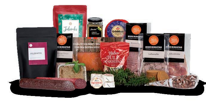 Innhold Lefsesylte skåret 100g, Julepostei ovnsbakt 200g, Tine greddost 380g, Jacobs sennep grov 180g, Røkt laks skivet gavesjaktel 150g, Julemiks 150g merkesjokolade biter, Norsk spekeskinke skivet 100g, Julekaffe filtermalt 200g, Rødvinspølse snabb 260g, Pepperkaker 150g, Brie mini 5 stk x 30g, Kyllingbryst m/urter skåret 100g, Ribberull 100g, Holmens Brente mandler 100g, Skaupølse med elg og blåbær 270g, Nidar Julemarsipan 138g.