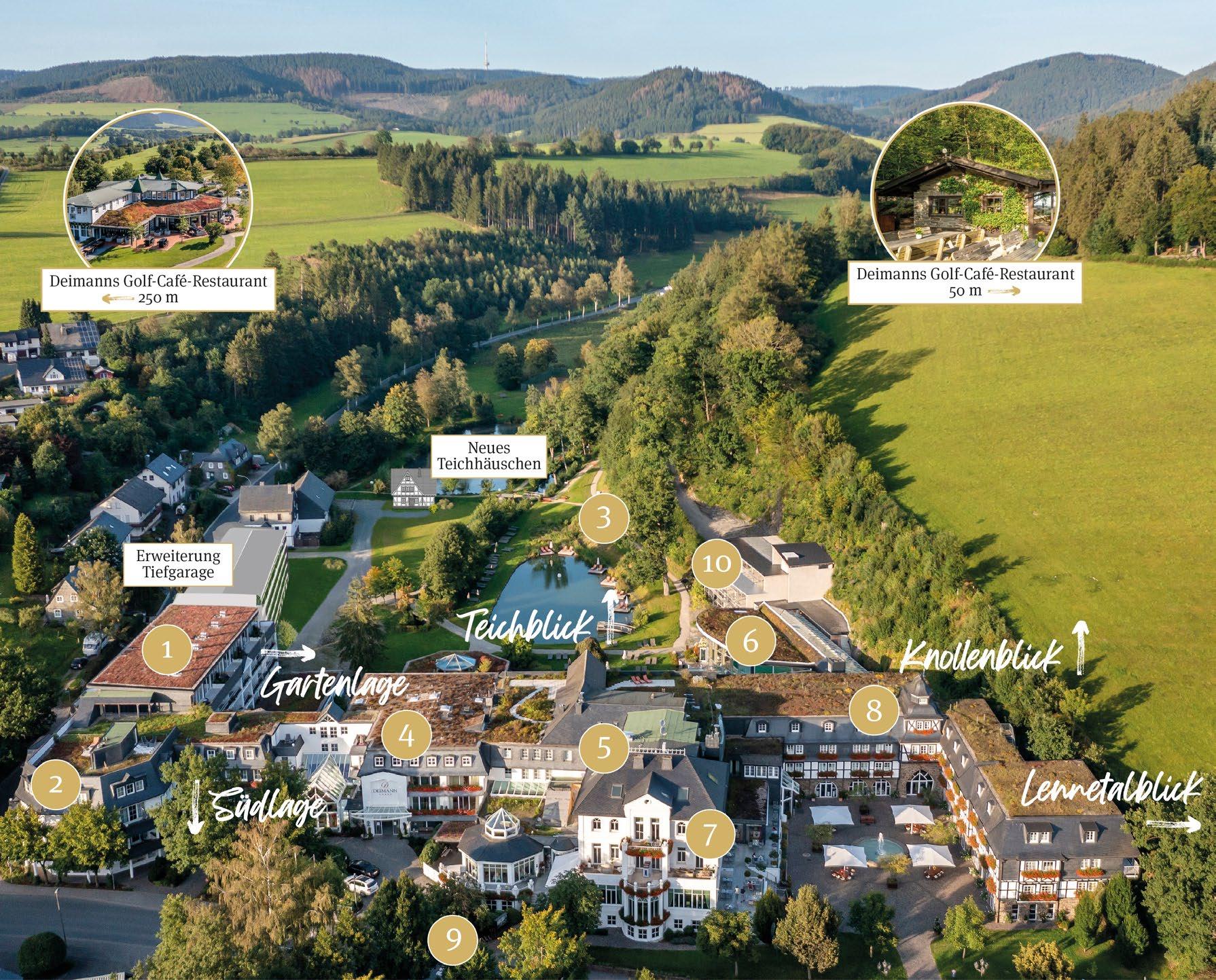 Damit Sie sich besser zurecht finden, gliedern wir unser Hotel in die 6 miteinander verbundenen Gebäudeteile Stammhaus, Gutshof, Haupthaus, Alte Sägerei, Holzkontor und das Sorpehaus! Darüber hinaus können Sie aus den Bezeichnungen Südlage, Innenhof, Lennetal, Knollenblick, Teichblick und Gartenlage die Ausrichtung der Zimmer ersehen. Zimmer mit Gartenlage oder Teichblick sind dabei unsere ganz besonderen Ruhelagen! Der Übersichtsplan auf Seite 4/5 hilft Ihnen bei der Orientierung.