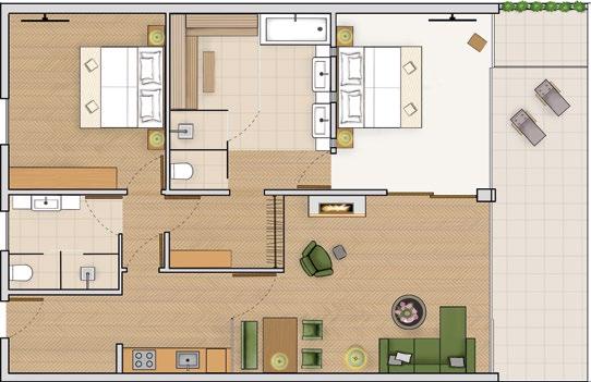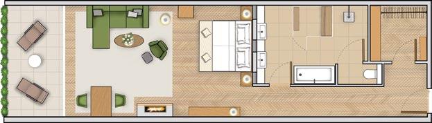 42 m2 Balkon, kombinierter Wohn- Schlafbereich, Ankleidezimmer, Doppelwaschbecken, Dusche, separates WC