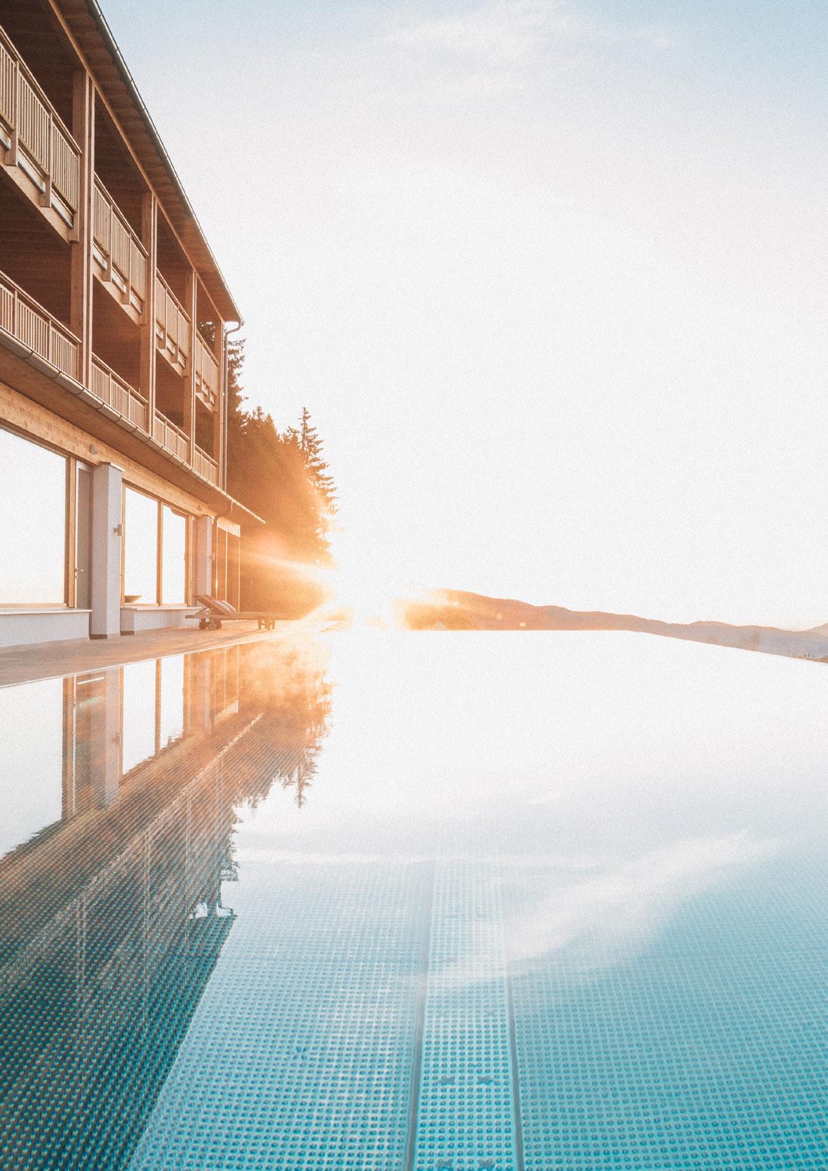 Wenn wir da jetzt rüber schauen, da vorne, nein eigentlich da hinten, dann blitzt es auf einmal so blau. Blau blau blau wie der Enzian … Simon: Blau blau blau wie der Enzian … und nix da Ozean. Aber im Ernst. Wir blicken auf ein spannendes Jahr mit vielen lässigen Investitionen in die Qualität unseres Angebots zurück. Das Ohr beim Gast, den Kopf in der Zukunft, die Ärmel hochgekrempelt. Und schon waren sie da, die neuen best friends unserer Gäste. Der 20-m-Infinity Pool, die so großzügige Panorama-Sauna, neue Liegeräumlichkeiten mit Weitblick, Fitness und Co. Nur die Natur ist ein wenig sauer auf uns – verbringt der Gast dadurch jetzt durchschnittlich eine Stunde länger im Spa-Bereich als in der freien Wildbahn da draußen.