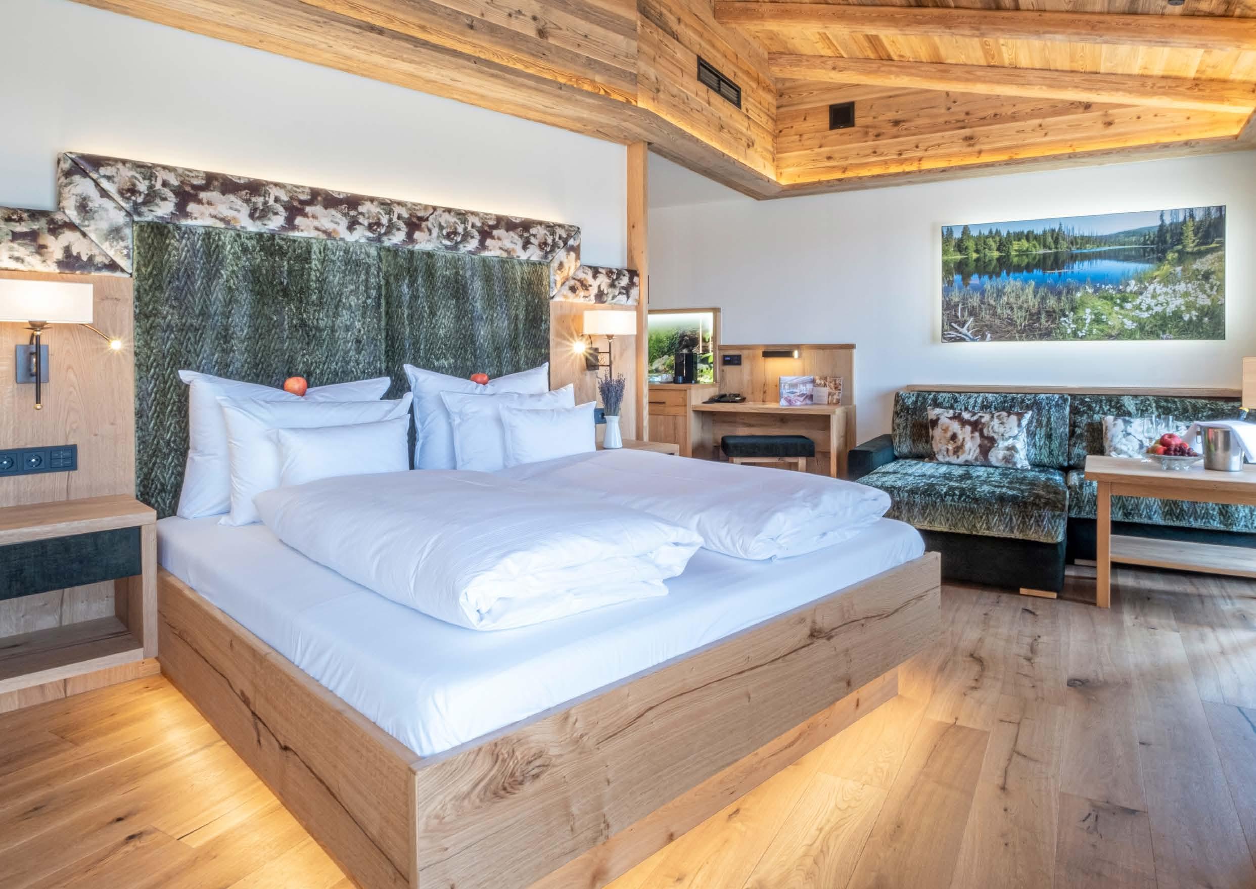 Unsere Natur- und Wohlfühlzimmer begeistern durch ihre einzigartige und nachhaltige Ausstattung mit Altholz aus mindestens 58 abgebauten alten Gebäuden aus der Umgebung, inspiriert von der traditionellen Bauweise im Bayerischen Wald.