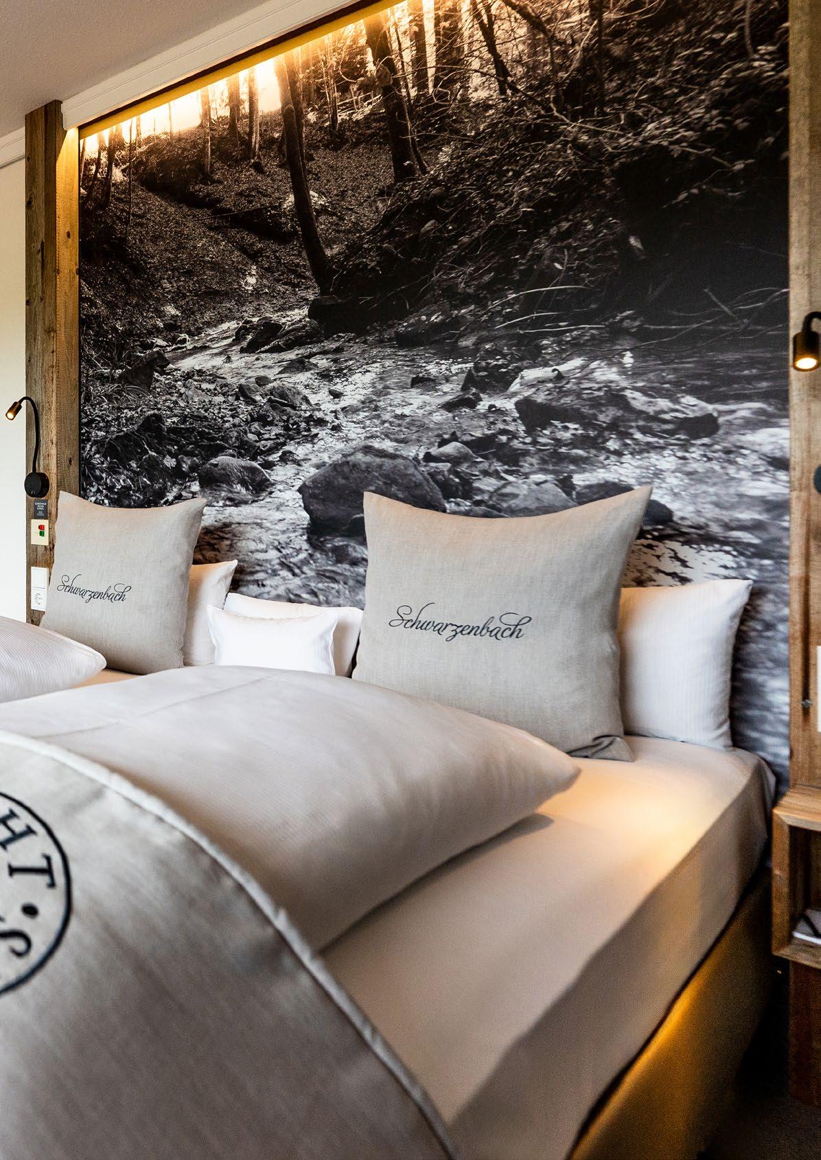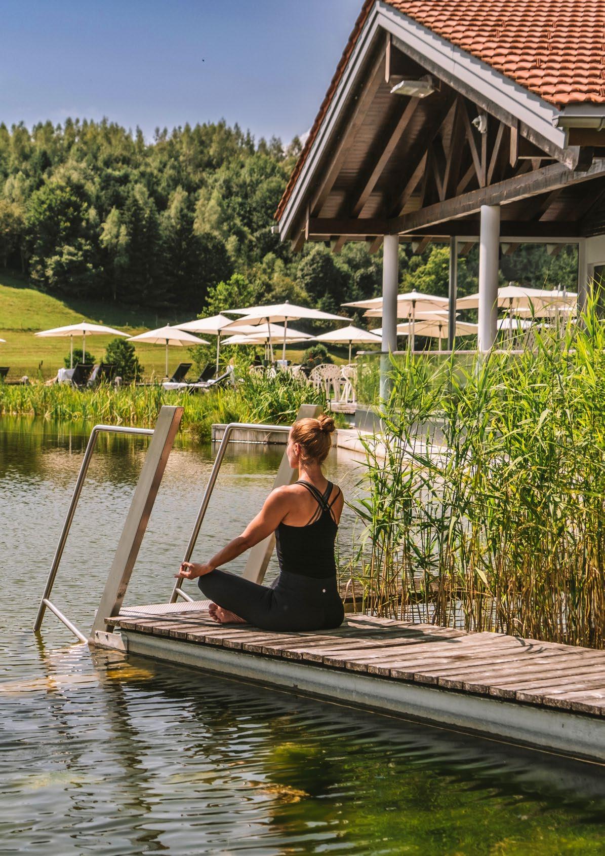 als „Momente des Glücks“. Damit fokussiert sich die Familie schon immer auf das Ursprüngliche: die Natur. Über die Jahre entwickelte sich daraus ein umfassendes „Wellbeing-Konzept“, das viel mehr ist, als man glaubt. „Nachhaltiges Wohlbefinden entsteht durch bewusste Ernährung und leichte Bewegung in der Natur.“ In der richtigen Umgebung ergibt sich daraus ganz automatisch mentale Entspannung. Das liegt daran, was schon die Großeltern hier wussten: „Dieser Ort tut einfach gut.“ Das Gelände zwischen Naturbadesee und Schwalbennest ist perfekt für nachhaltige Erholung und tiefe Entspannung. Die Basis dafür sind Haubers Themenzimmer und Suiten zwischen Bergen, Wiesen und Wald. Diese Säule heißt „Dein Raum“ und ist eine von sechs, die die Gesundheit im Alter erhalten. Dazu gehören außerdem „Deine Zeit“, „Dein Verzicht“, „Dein Genuss“, „Dein Antrieb“ und „Deine Freude“. Die Zeit sinnvoll gestalten lässt sich in der Sauna, im Relax-Pool und in frisch aufgeschüttelten Bergheubetten – dort finden Gäste den Weg in ein tiefes Wohlgefühl. Bei der Säule „Dein Verzicht“ bietet Haubers Team vier verschiedene