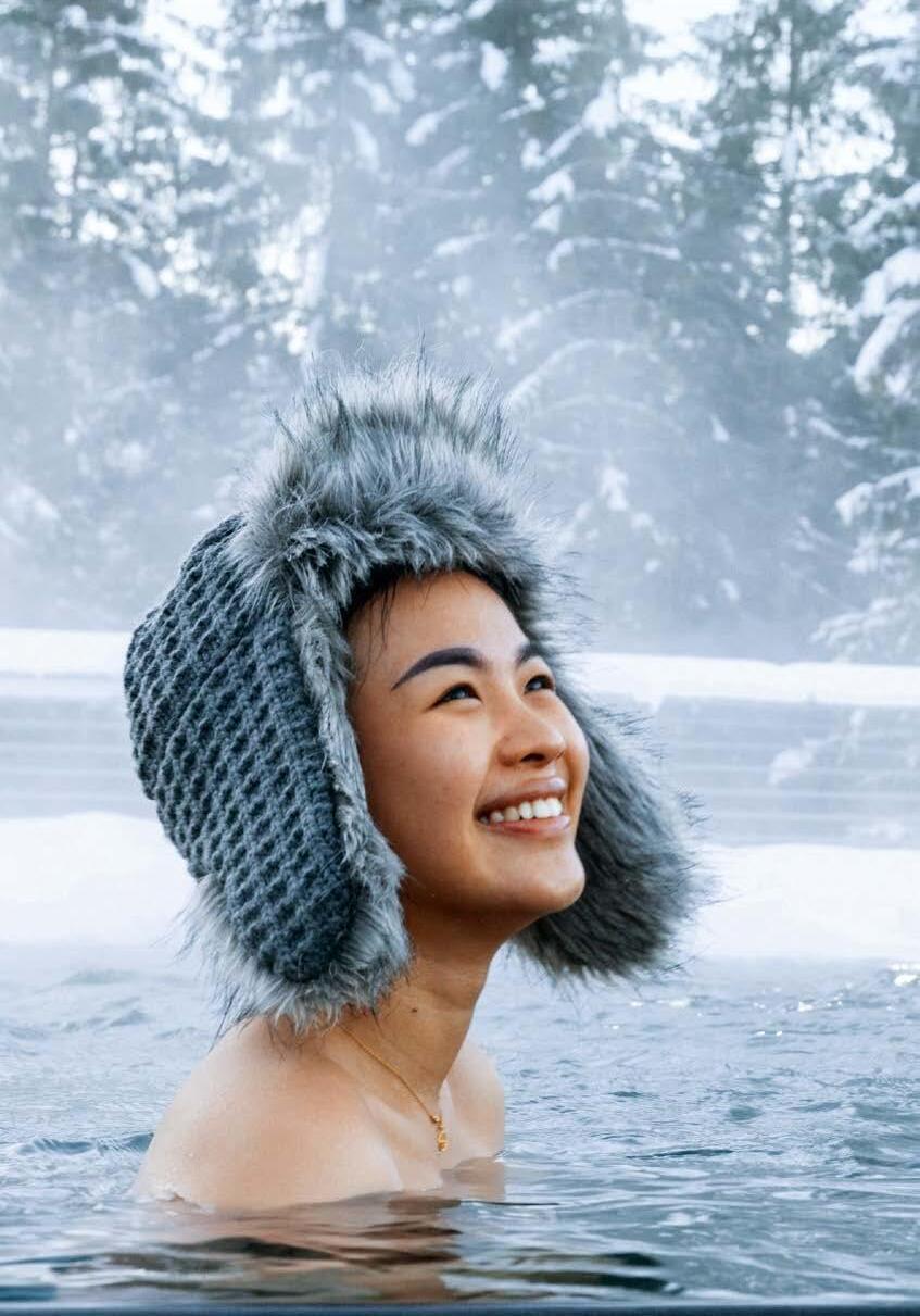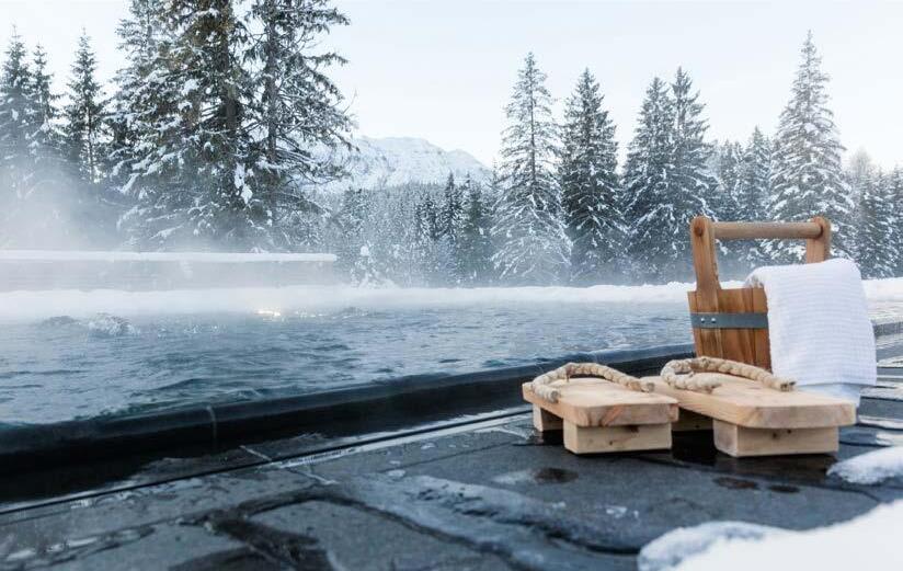Der Outdoor-Onsen – ein Heißwasserpool mit 40 °C im japanischen Stil – ist besonders spektakulär bei Regen, Nebel, Schneefall.