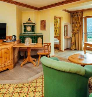 1 Schlafzimmer mit gemütlichem Wohnbereich, Sitzecke und Kachelofen, 1 getrenntes Schlafzimmer mit 2 Erw.-Betten, Vorraum, 2 Bäder (1x Dusche, 1x Dusche und Wanne), WC, 2 Flat-TVs, Telefon, Minibar, Safe, Balkon