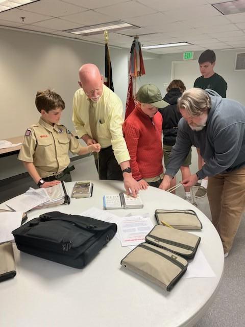 Dave Stock reviews the contents of a survival kit for the Merit Badge.