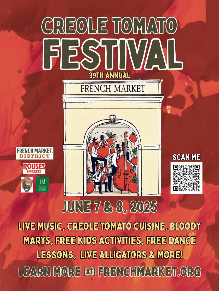 Enjoy Creole tomato food booths featuring Creole tomato-inspired dishes, as well as live music and activities for the whole family at the historic French Market. frenchmarket.org