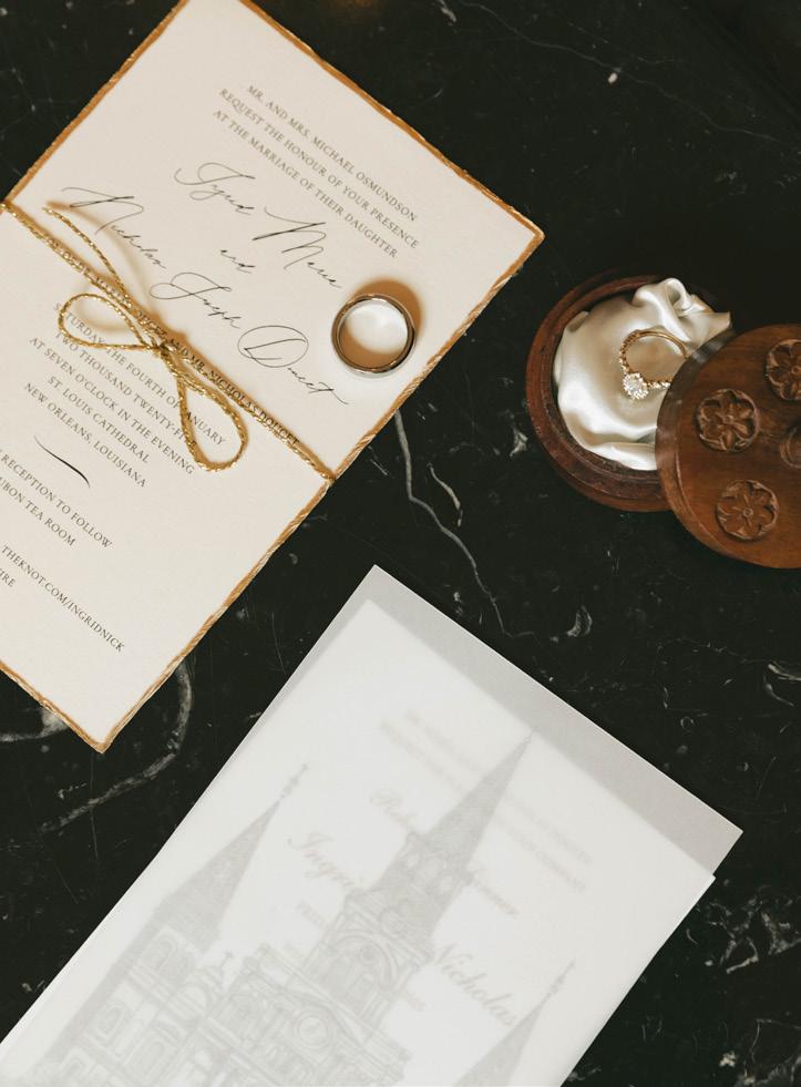 After Ingrid joyfully said yes, they began planning a winter wedding. On January 4, 2025, the two were married at St. Louis Cathedral, where Father Jeff Merritt pronounced them husband and wife. The cathedral was still beautifully decorated for the Christmas season, which beautifully complemented the eucalyptus green and champagne shades in the wedding party’s attire.