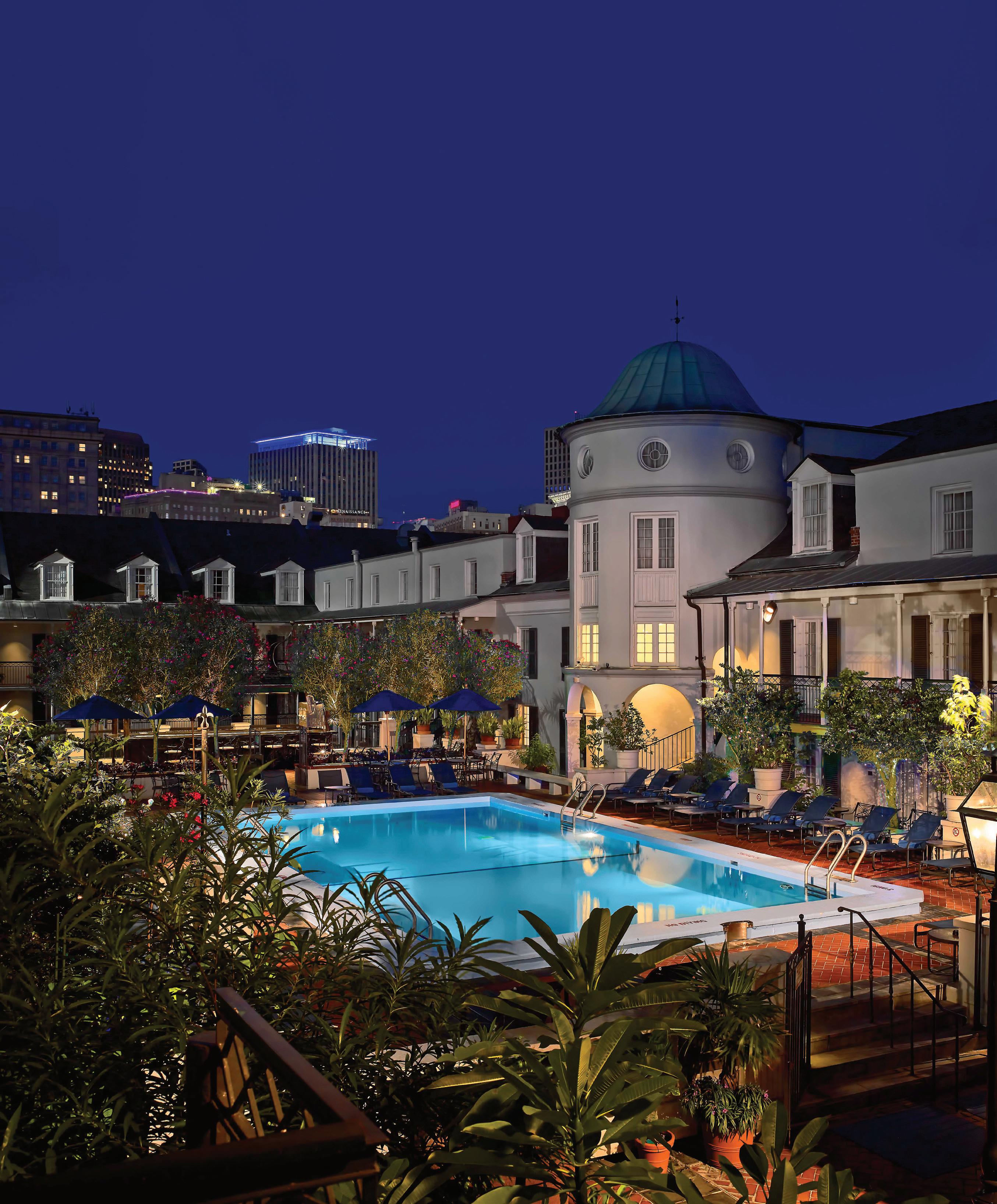 ferred area to be seen. Flowering plants, magnolia trees, and lively awnings created an elegant, shaded space. Wooden benches from Ursulines Convent were set against the vine-covered red brick walls.