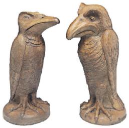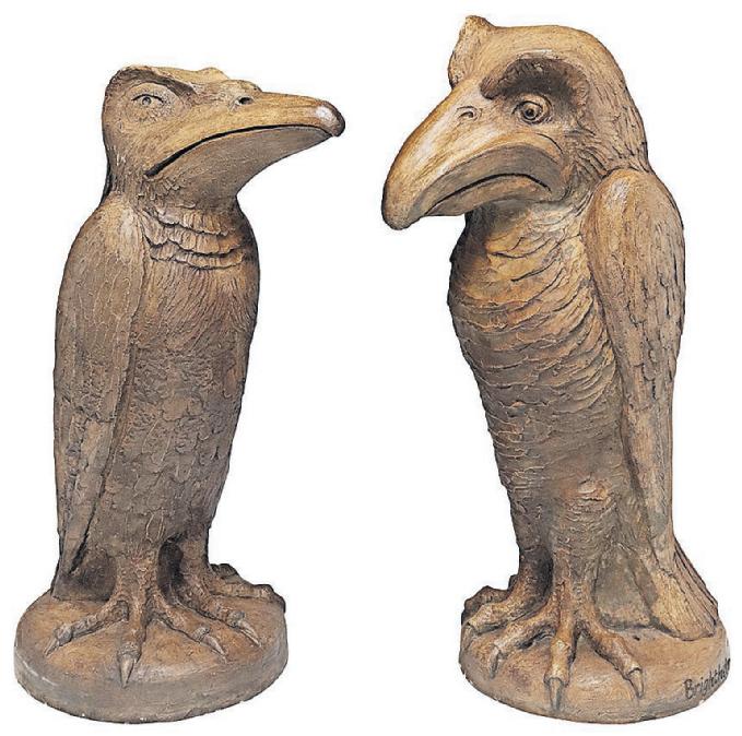 THEY SAY THAT IMITAtion is the highest form of praise, and it follows that the most desirable antiques are often the most reproduced. Take the famous “Wally Birds” made by Martin Brothers of England in the late 19th to early 20th centuries. These fanciful stoneware bird figures with heavy texture, colorful glazes and endearingly grotesque faces can sell for $50,000 or more. Unsurprisingly, they have many imitators that sell for lower prices. But less expensive doesn’t always mean inexpensive. This set of two garden statues inspired by Martin Brothers’ birds sold for $1,037 at Austin Auction Gallery. It’s a low price for a pair of Wally birds, but fairly high for a vintage garden ornament. There’s no mistaking these Martin-style birds for the real thing. They are made of cast stone (a type of cement), not stoneware pottery, so they do not have the characteristic glaze. But their oversized beaks and almost humanlike facial expressions carry the same comical charm.