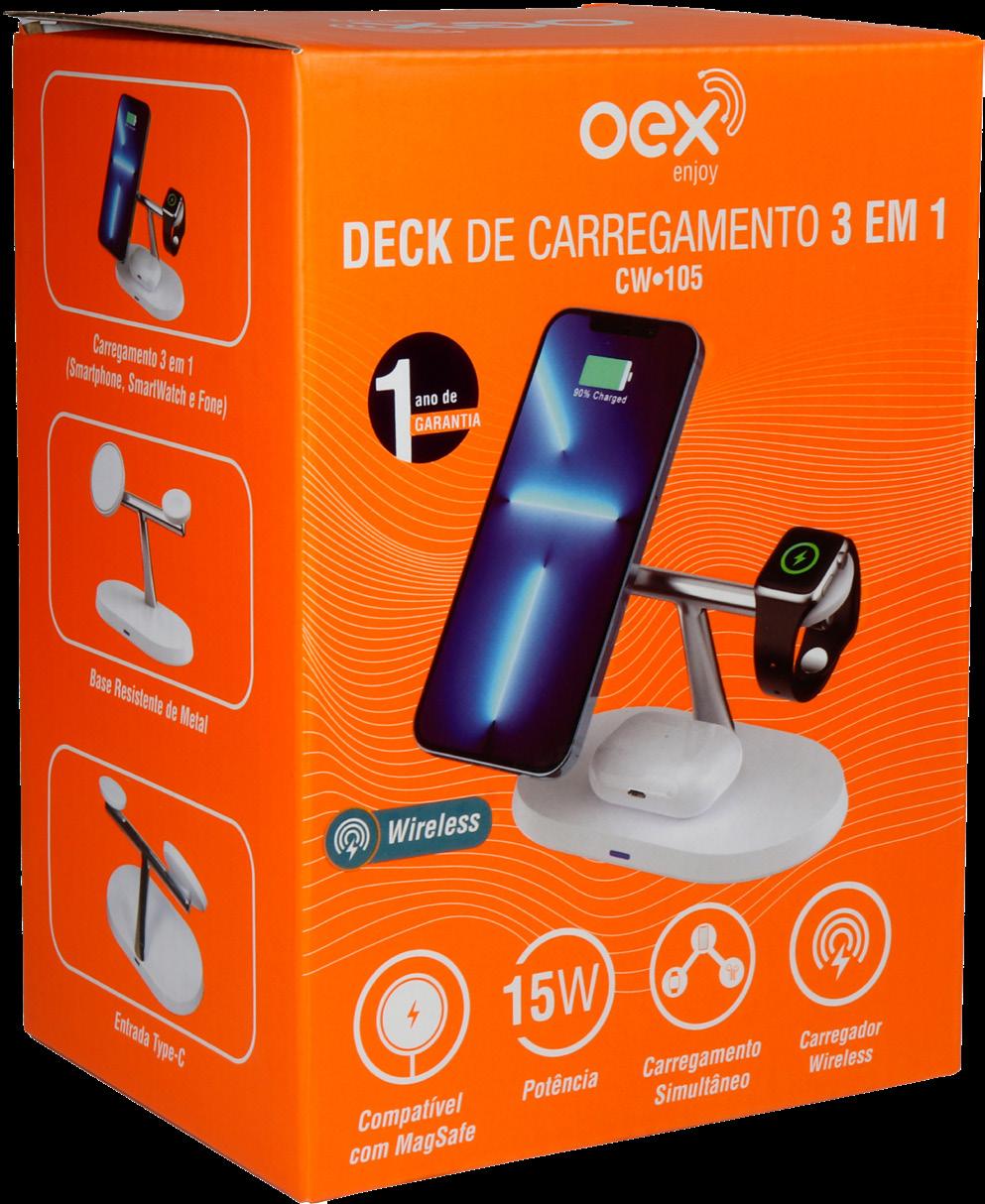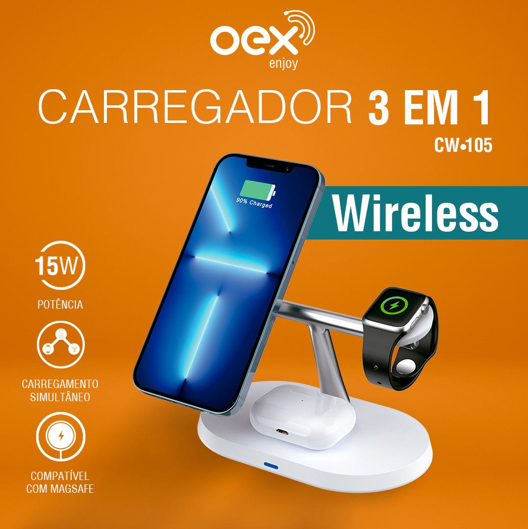 O carregador por indução Cw105 3 em 1 da Oex é um dispositivo que permite carregar vários dispositivos eletrônicos sem a necessidade de fios.