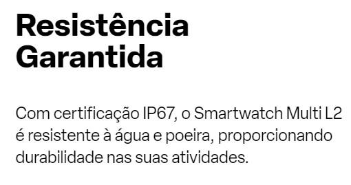 Com apenas 40g, o Smartwatch Multi L2 é incrivelmente leve, permitindo que você esqueça que está usando, enquanto se concentra no que mais importa, seus objetivos e desafios!