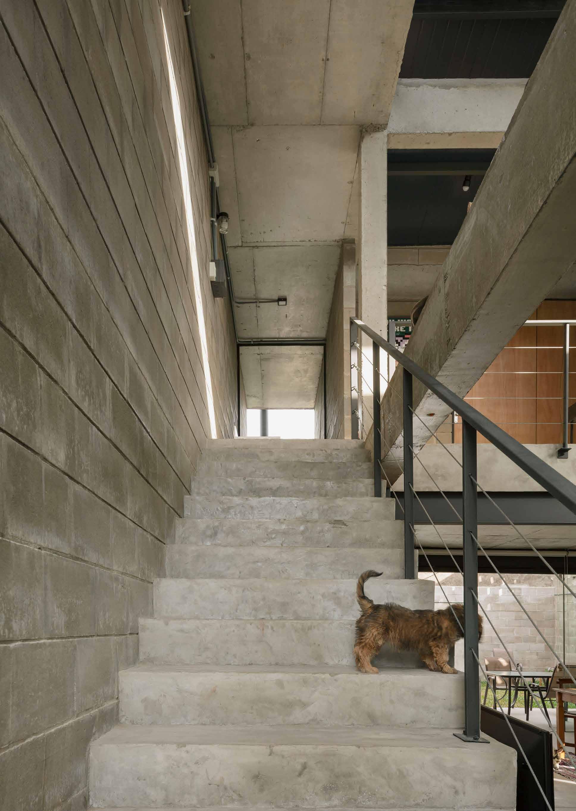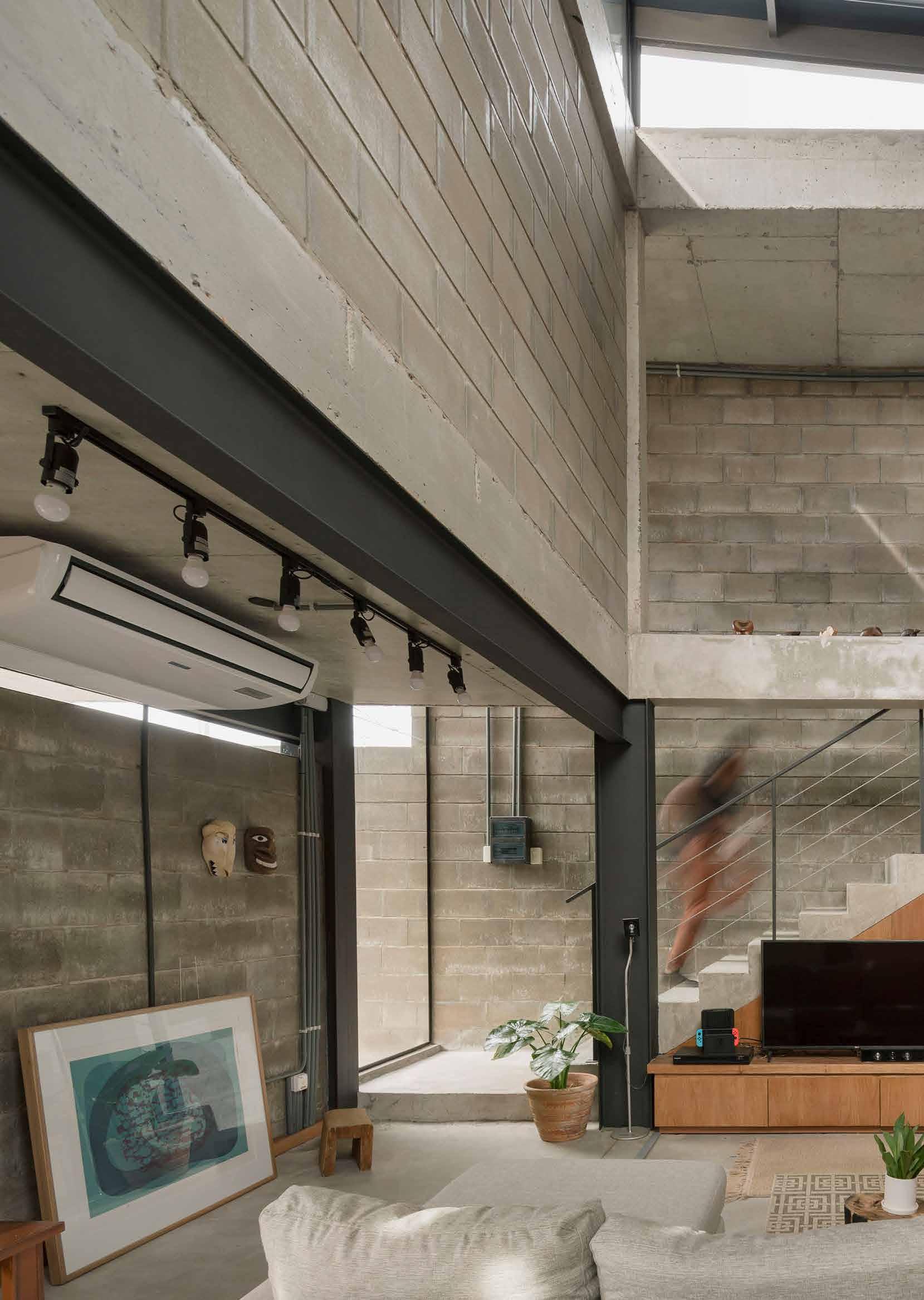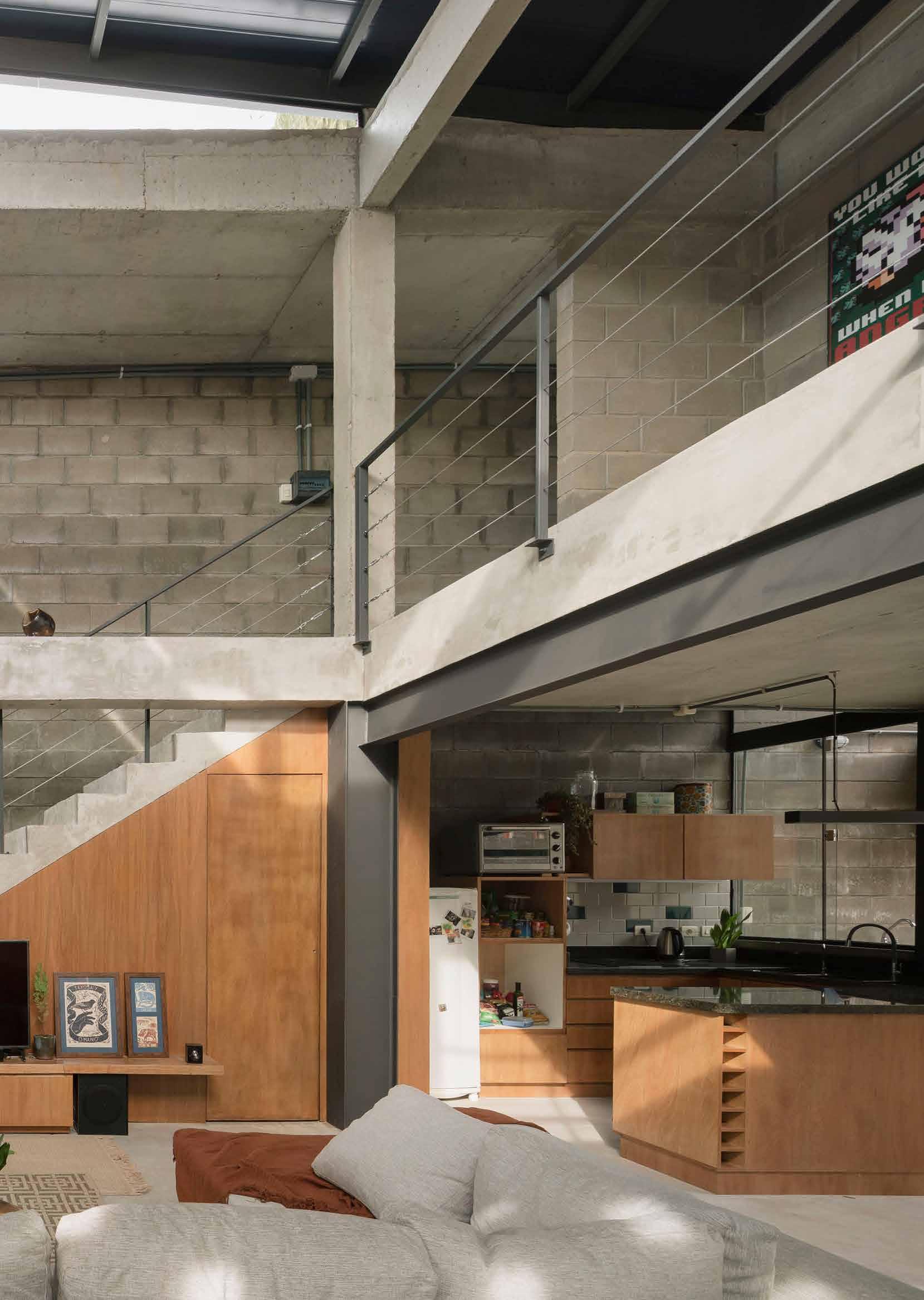 Con la premisa de economía y rendimiento de materiales, se preconfiguró el diseño de tal forma que pisos y paredes no lleven revestimientos adicionales ni revoques, salvo en áreas húmedas. Las instalaciones son externas, el mobiliario fijo es de enchapado de madera, dejando todas las texturas desnudas.
