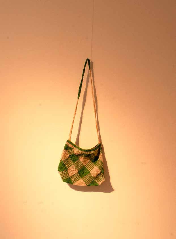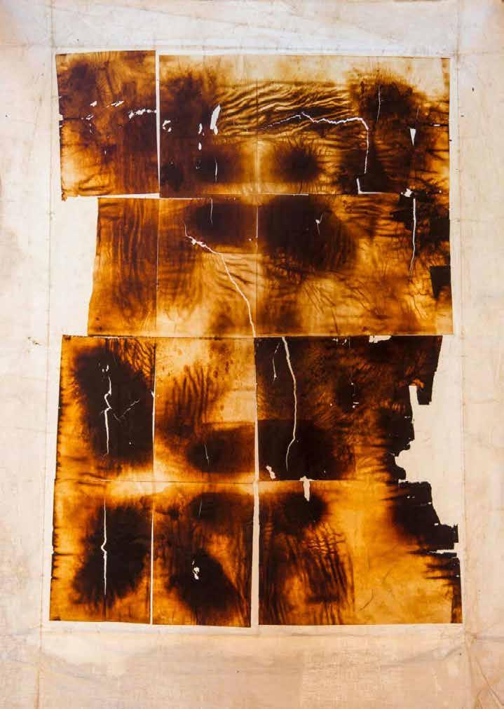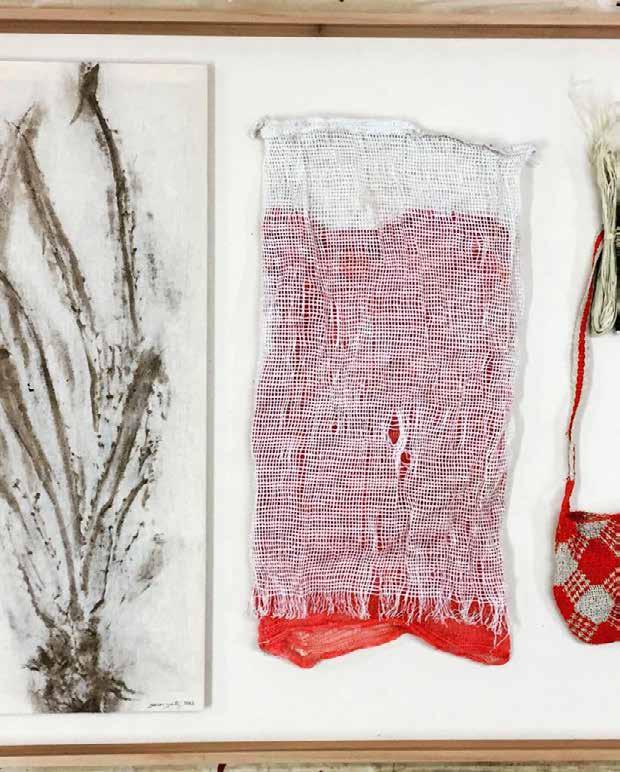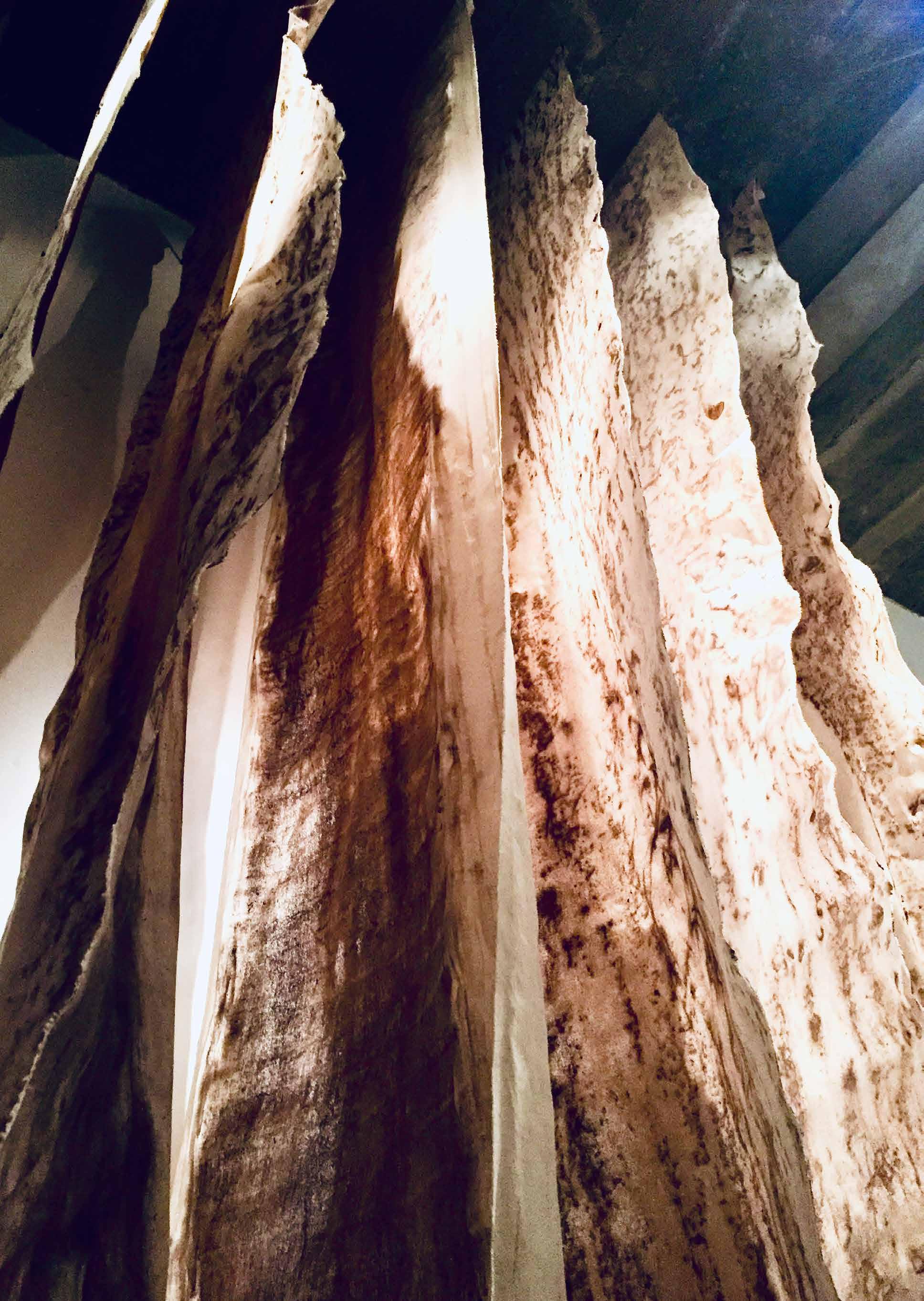 En Proyecto Herbolario, a través de la fijación de la textura de distinas cortezas, con tinte realizado con diferentes tipos de tierras y minerales presentes en la geografía del Paraguay, Benitez imprime sobre textiles de algodón formas presentes en árboles nativos.