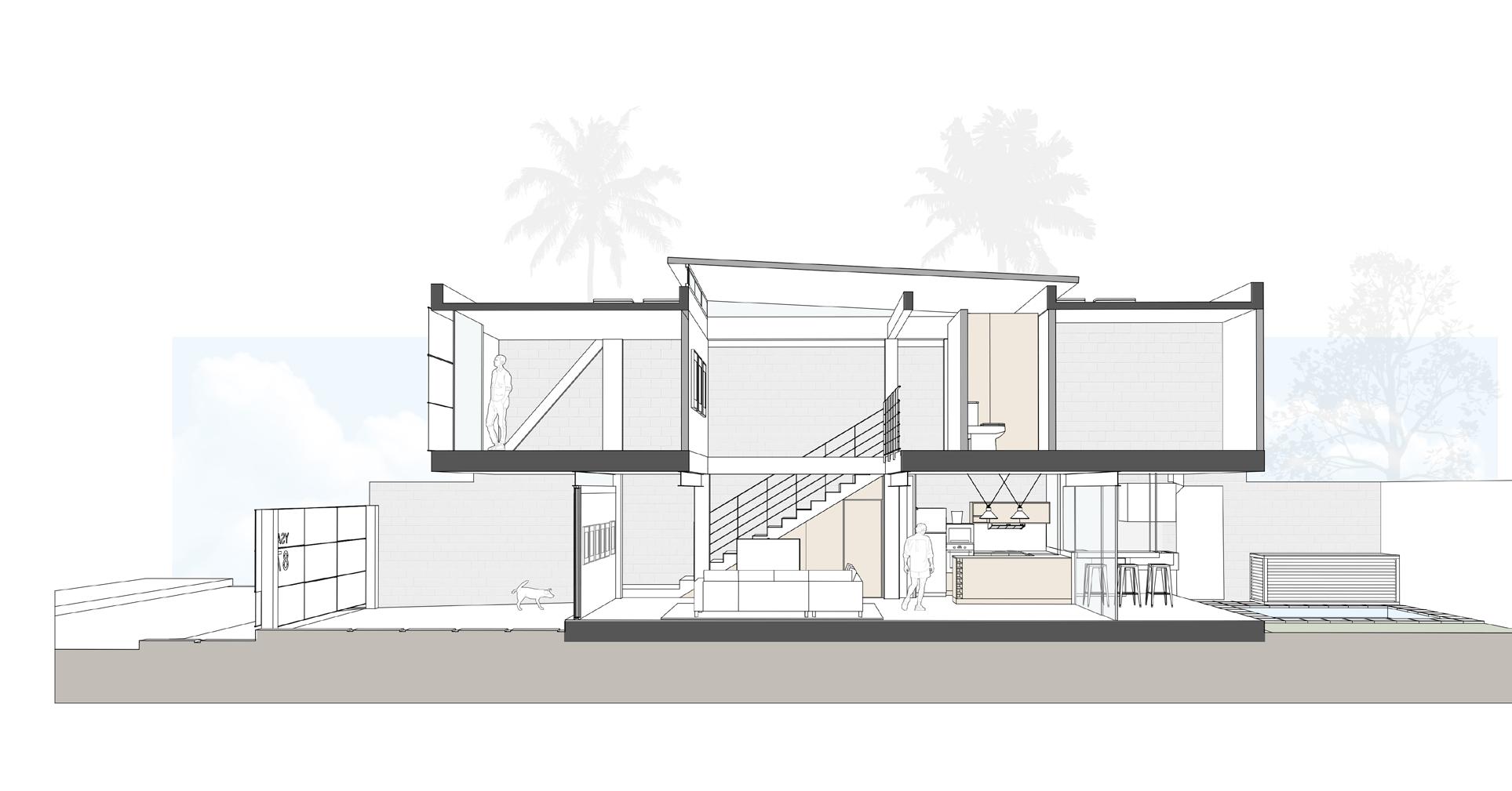Los bloques íntimos superiores, forman entre sí una doble altura sobre el área social, con una abertura cenital que permite la ventilación, dejando escapar el aire caliente del interior de la vivienda. El retiro lateral abierto, ilumina de forma indirecta los espacios y los ventila, además de cumplir la función de paso de las instalaciones (sanitarias y eléctricas), a futuro con abundante vegetación acompañada por un filtro de bloques, que reduce la incidencia solar.