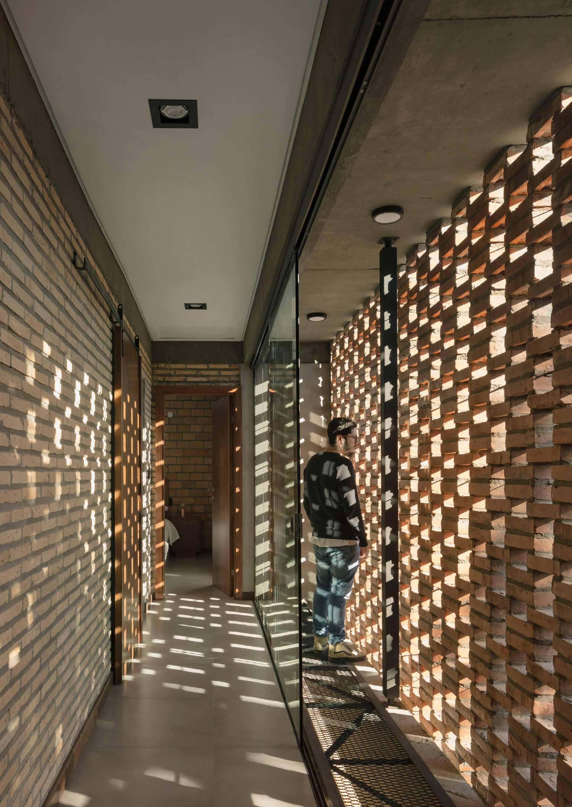 Controlamos la incidencia solar más comprometida con un filtro de ladrillos que tamiza la luz solar generando sombras y penumbra que tiñen los