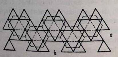 la lámina octaédrica por iones de hierro, magnesio, zinc, niquel y otros. El ion de aluminio puede sustituirse por uno de magnesio y dos de aluminio por tres de magnesio. En el primer caso no todas las posiciones octaédricas serán sustituidas y la lámina tetraédrica tocará sus vértices con 2/3 los vértices de oxígeno de las bases de los ocatedro. En el segundo caso todas las posiciones octaédricas son sustituidas.