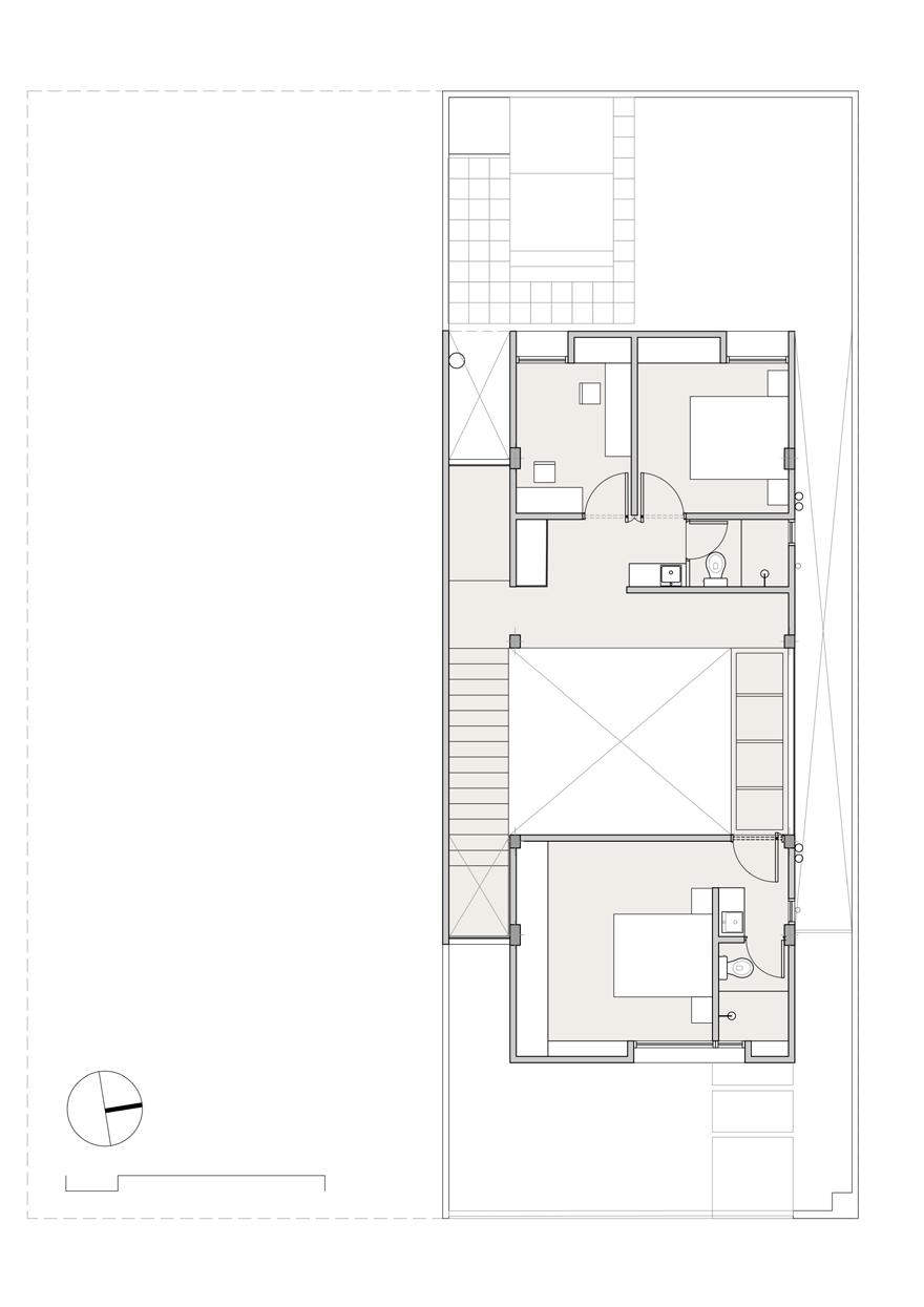 Así en planta baja, se limitan las divisorias, y en planta alta, se disponen dos bloques cerrados enfrentados. Todo el conjunto se separa del lindero al norte, por un patio lineal, y se cierra al sur, de abundantes lluvias.