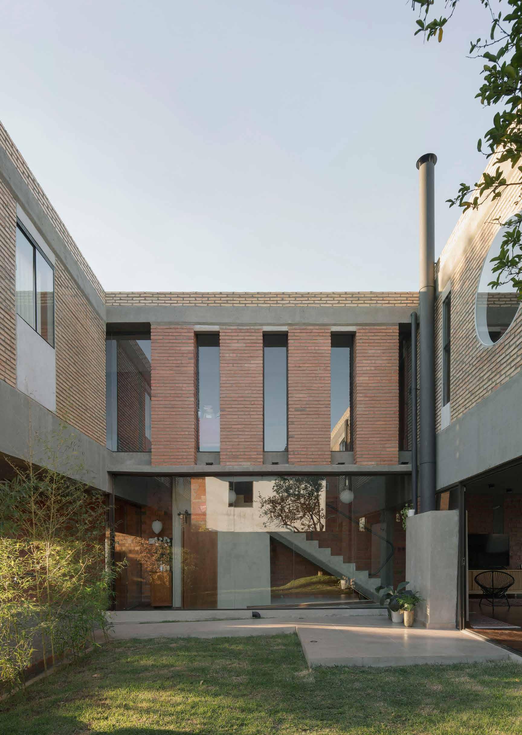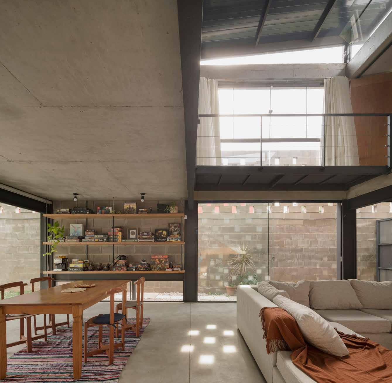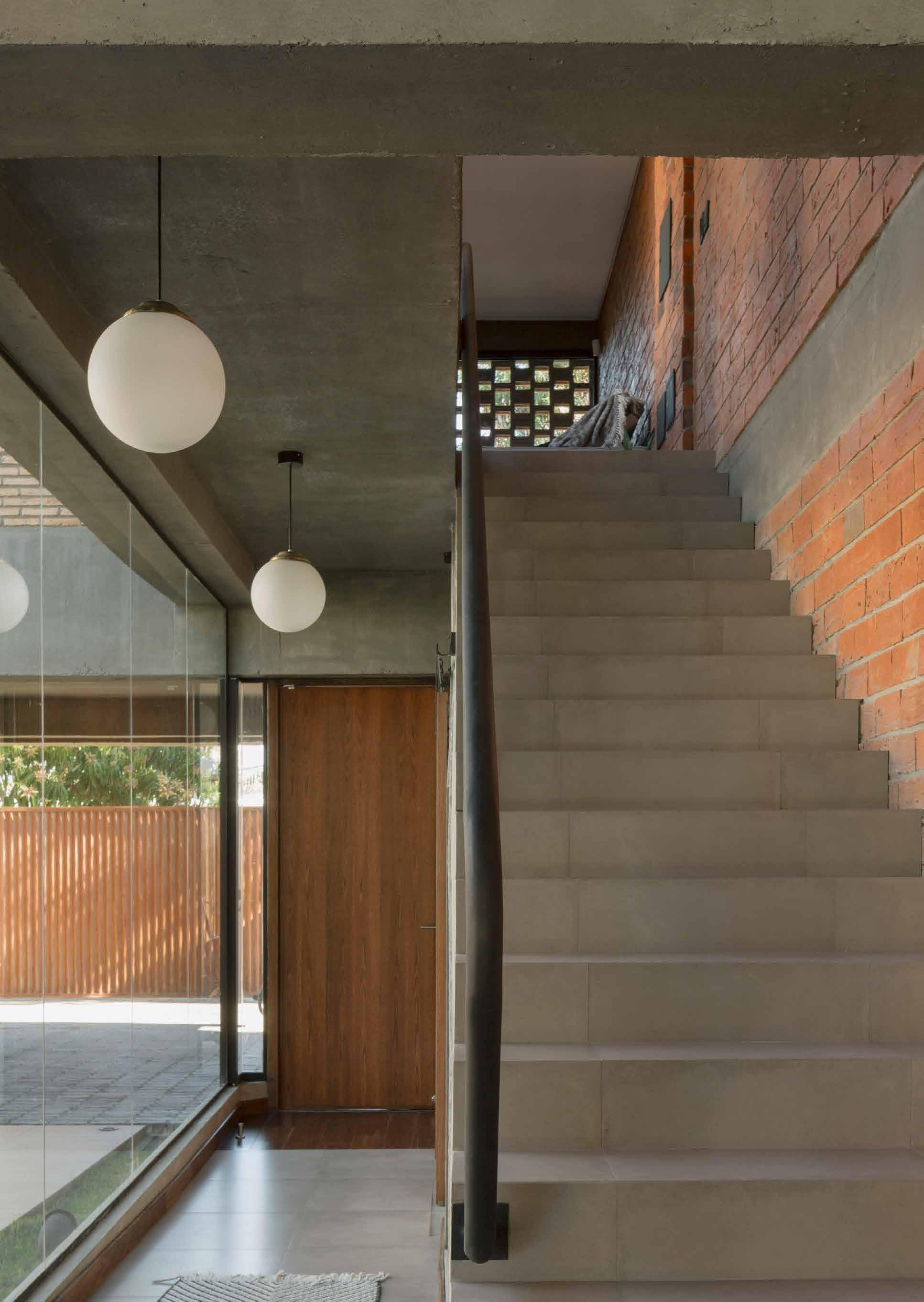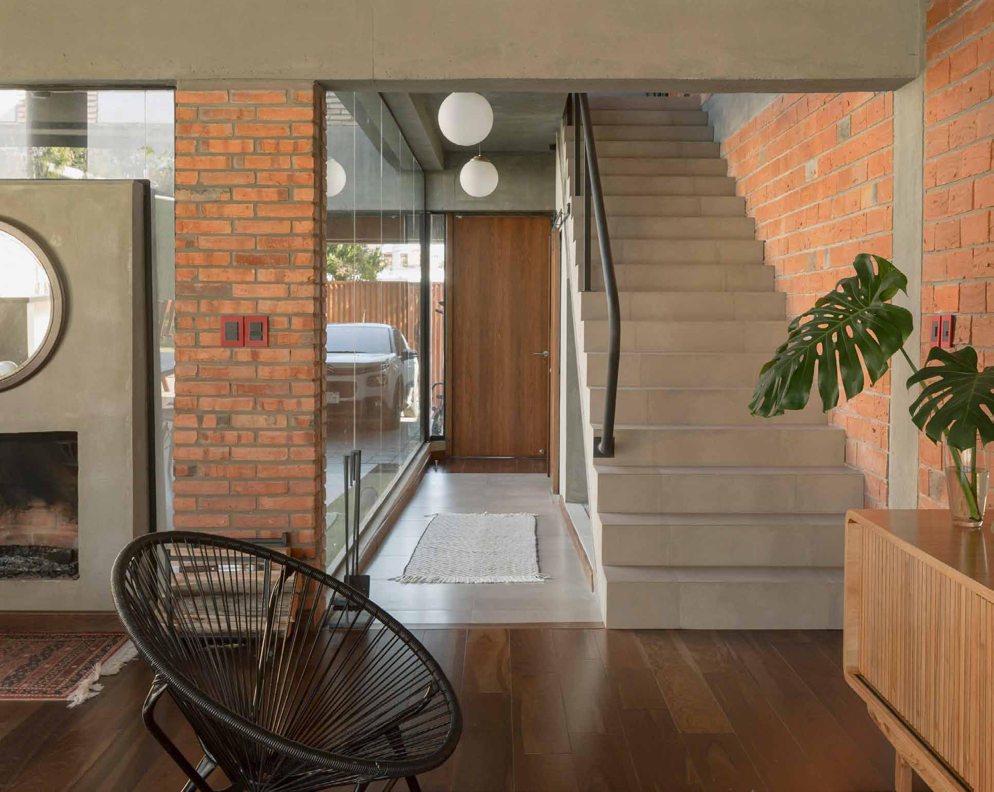 Logramos una integración espacial Gracias a la estructura de hormigón armado que eficientemente resuelve la estática de la casa pero a su vez es parte de la estética de la misma junto con el ladrillo a la vista. Los materiales que se utilizan se muestran tal como son, con sus imperfecciones y rastros de sus procesos constructivos.-
