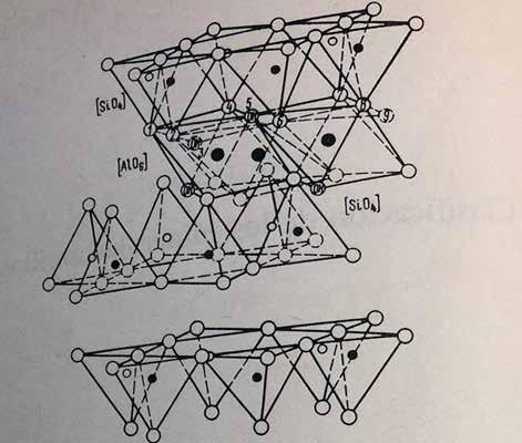 1:1); 2)dos tetraédricas y en medio de ellas una octaédrica (triforme o 2:1); y 3) dos teraédricas y en medio de las mismas dos octaédricas (tetraforme que pueden designarse como 2:2 o 1:1). Cada paquete elemental forma un placa de mineral arcilloso visible en el microscopio. La caolinita tiene combinación 1:1 y las micáceas 2:1, las cloríticas 2:2 y las Illitas son frecuentes las sustituciones isomorfas parciales en las combinaciones de láminas 2:1, típicas de láminas tetraédricas y ocateédricas. El Ion de silicio puede ser sustituido por un ion de alumnio y el de alumnio en