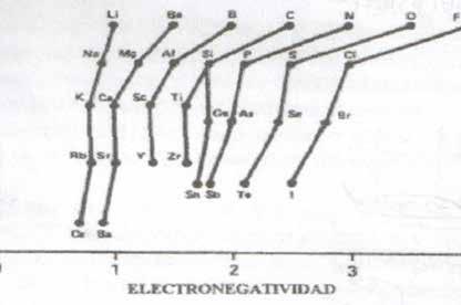 Escala de electronegatividades de Pauling. Los elementos a la izquierda tienen una menor afinidad por los electrones que aquellos elementos que se encuentran más a la derecha cuya afinidad por los electrones es mayor. (ROCHA, 2004)