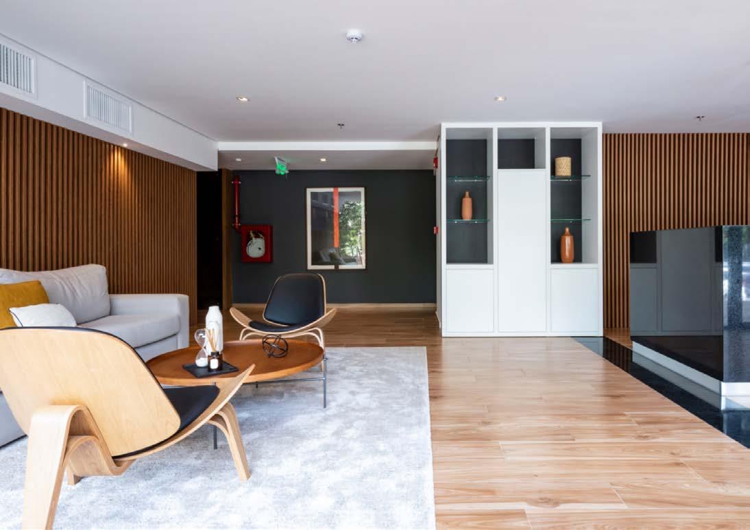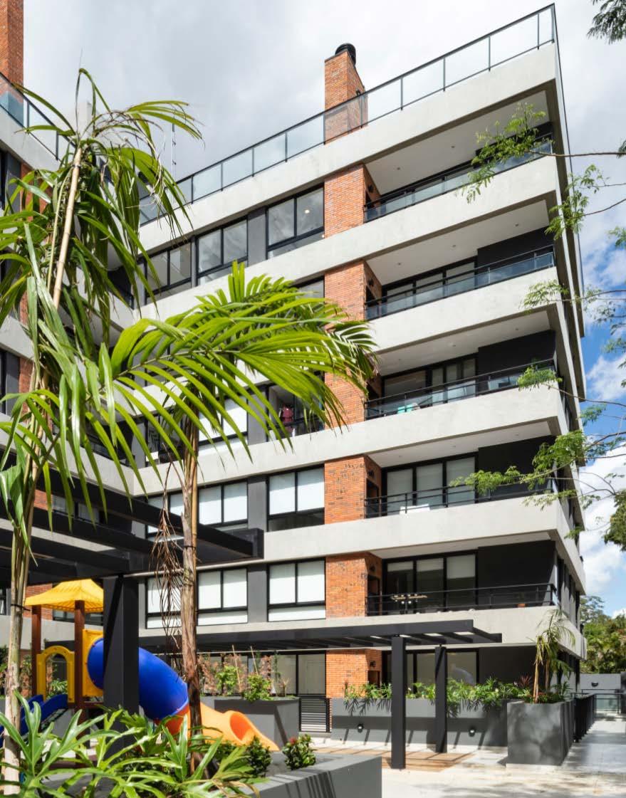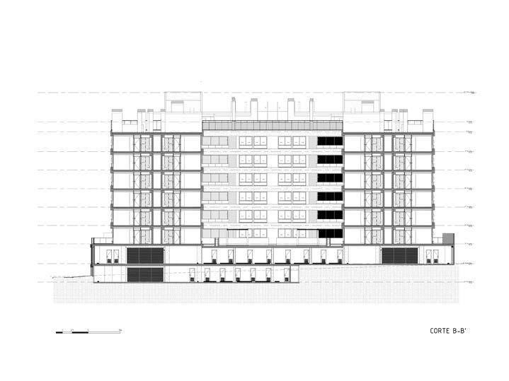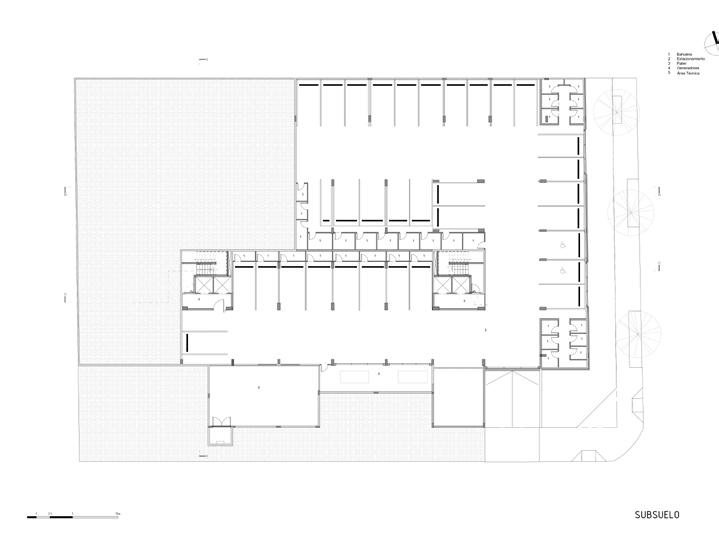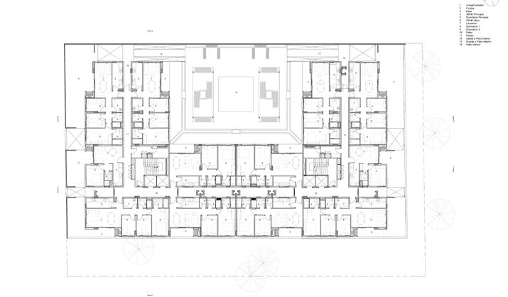 El edificio se inserta en un barrio muy residencial por lo que buscamos retirarlo de las calles y los linderos manteniendo árboles y generando vacíos que forman jardines y plazas publico-privadas.