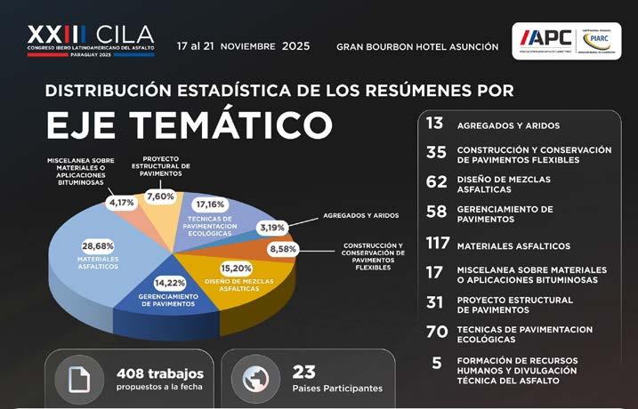 El Comité Organizador del XXIII Congreso Ibero-Latinoamericano del Asfalto (CILA) comunicó el cierre exitoso del periodo de recepción de resúmenes técnicos, en el marco del XXIII Congreso CILA Paraguay 2025, a realizarse del 17 al 21 de noviembre en Asunción. Se recepcionaron un total de 408 propuestas técnicas, provenientes de 23 países de Iberoamérica, Europa y América del Norte.