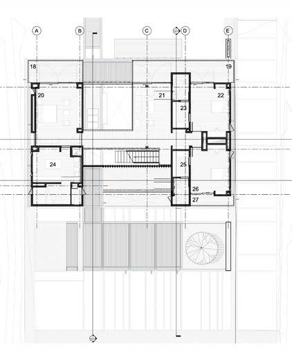 Una escalera localizada sobre la fachada de acceso y dispuesta al lado del jardín exterior, integra el primer y el segundo nivel. En su lugar de llegada se articula con un espacio colectivo familiar que a su vez separa las habitaciones de los hijos de la habitación principal. Una sucesión de vacíos sobre el primer nivel conforma dobles alturas en el espacio interior y define la levedad de los planos horizontales que se apoyan sobre los muros y los volúmenes que conforman los espacios privados.