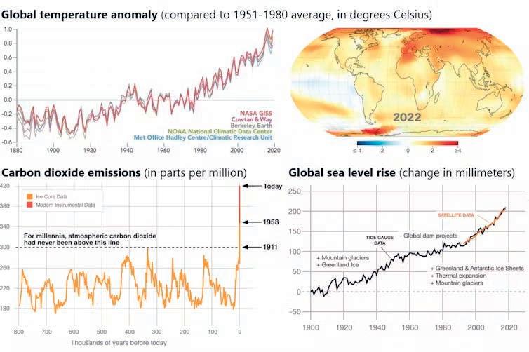 Os gráficos mostram como a temperatura global, as emissões de dióxido de carbono e o nível do mar aumentaram ao longo do tempo