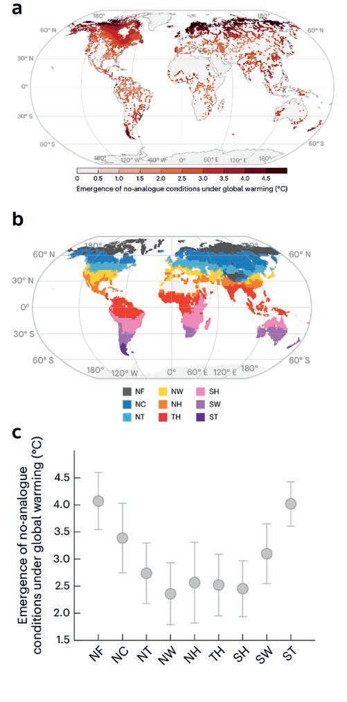 em todo o mundo enfrentarão climas não análogos até o final deste século. No entanto, o momento do surgimento varia globalmente. Os lagos tropicais, que abrigam uma rica biodiversidade, serão os primeiros a experimentar condições sem precedentes quando o aquecimento global atingir ~2,4°C (acima das condições pré-industriais).