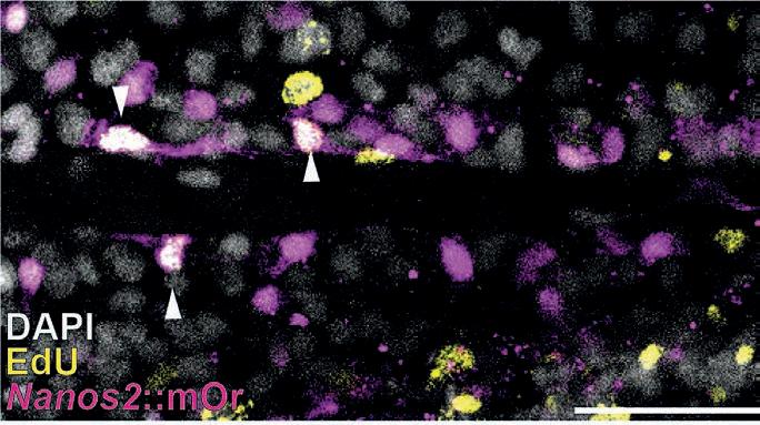 A fluorescência vermelha (Nanos2) marca as células-tronco transgênicas putativas, a branca (DAPI) são todos os núcleos celulares e a amarela (EdU) aquelas células que estão ativamente envolvidas na síntese de DNA, portanto no ciclo celular como algumas das células-tronco