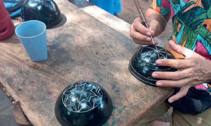 As cuias pintadas, símbolo da identidade cultural dos ‘Pinta Cuias’, há muito haviam caído em desuso, e a habilidade de tingir e bordar esses objetos havia se perdido. A oficina, ministrada por artesãs da ‘Associação das Artesãs Ribeirinhas de Santarém’, representou um momento de resgate histórico para a comunidade, proporcionando aos participantes a oportunidade de aprender e reaplicar técnicas que antes eram parte do cotidiano de seus antepassados.