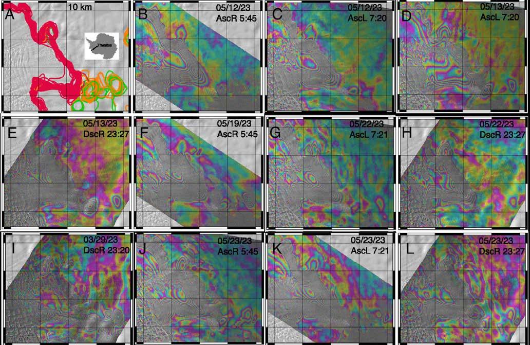 cm) de água subglacial pressurizada, o que facilita a intrusão e o levantamento hidráulico da água do mar. O painel no topo mostra franjas interferométricas diferenciais associadas à flexão do gelo no oceano e zonas de ancoragem de gelo em baixa ( Topo ) e alta altura da superfície do mar (SSH) ( Abaixo ). As franjas de deformação em olho de boi mais a montante refletem a subsidência do gelo vs. elevação em torno de uma depressão do leito em SSH baixo vs