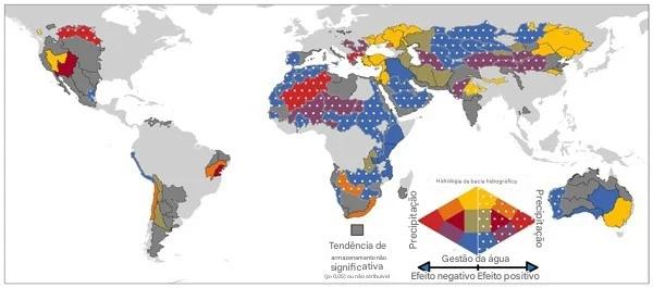 Esse mapa aí no topo desta página mostra os anos em que os dados de satélite indicam que o armazenamento de água terrestre atingiu um mínimo de 22 anos em cada local. O declínio da água doce global começou com uma seca massiva no Norte e centro do Brasil, seguida logo por uma série de grandes secas na Australásia, América do Sul, América do Norte, Europa e África. A equipe de pesquisadores identificou essa diminuição abrupta e global de água doce usando observações dos satélites GRACE (Gravity Recovery and Climate...